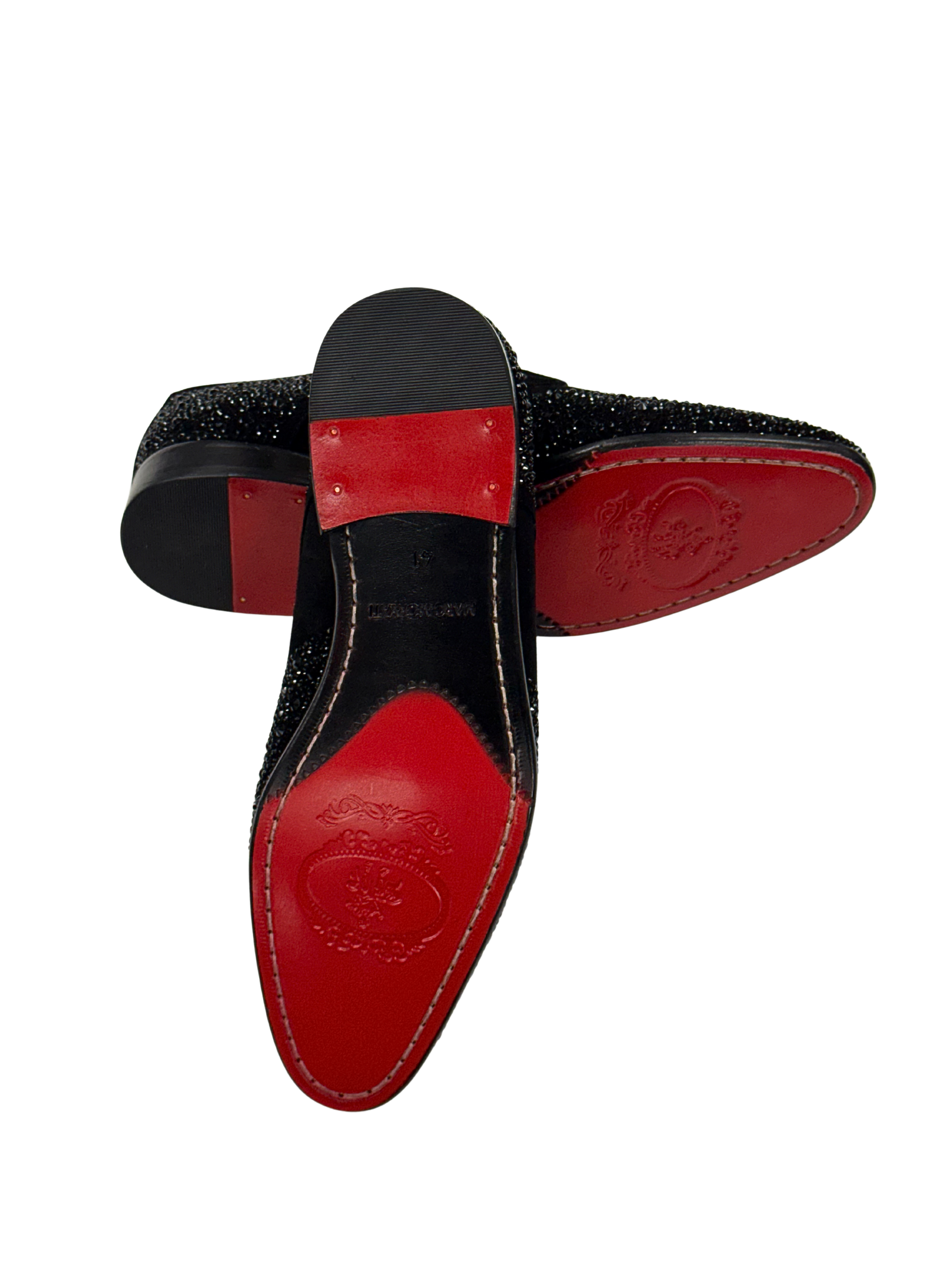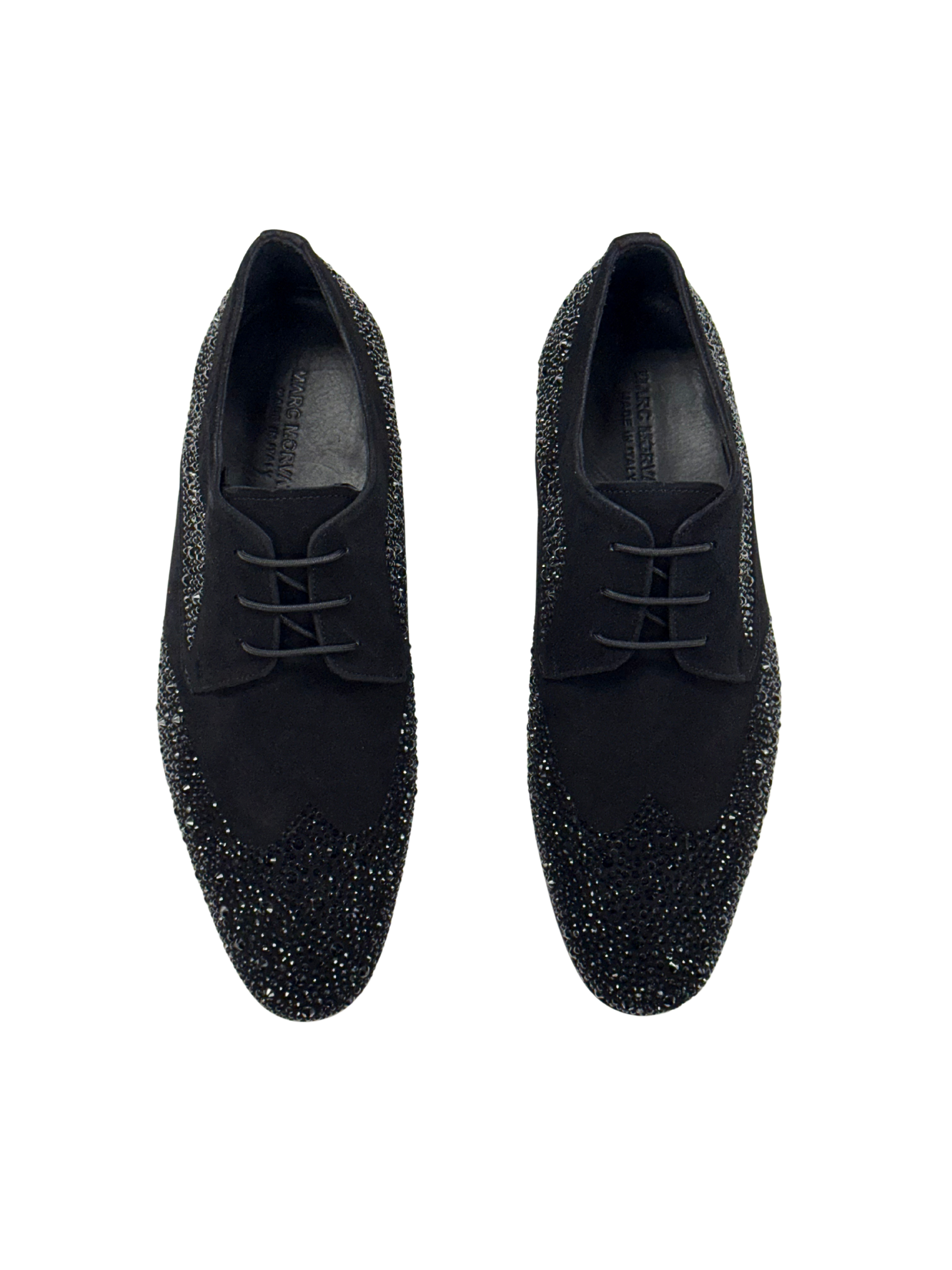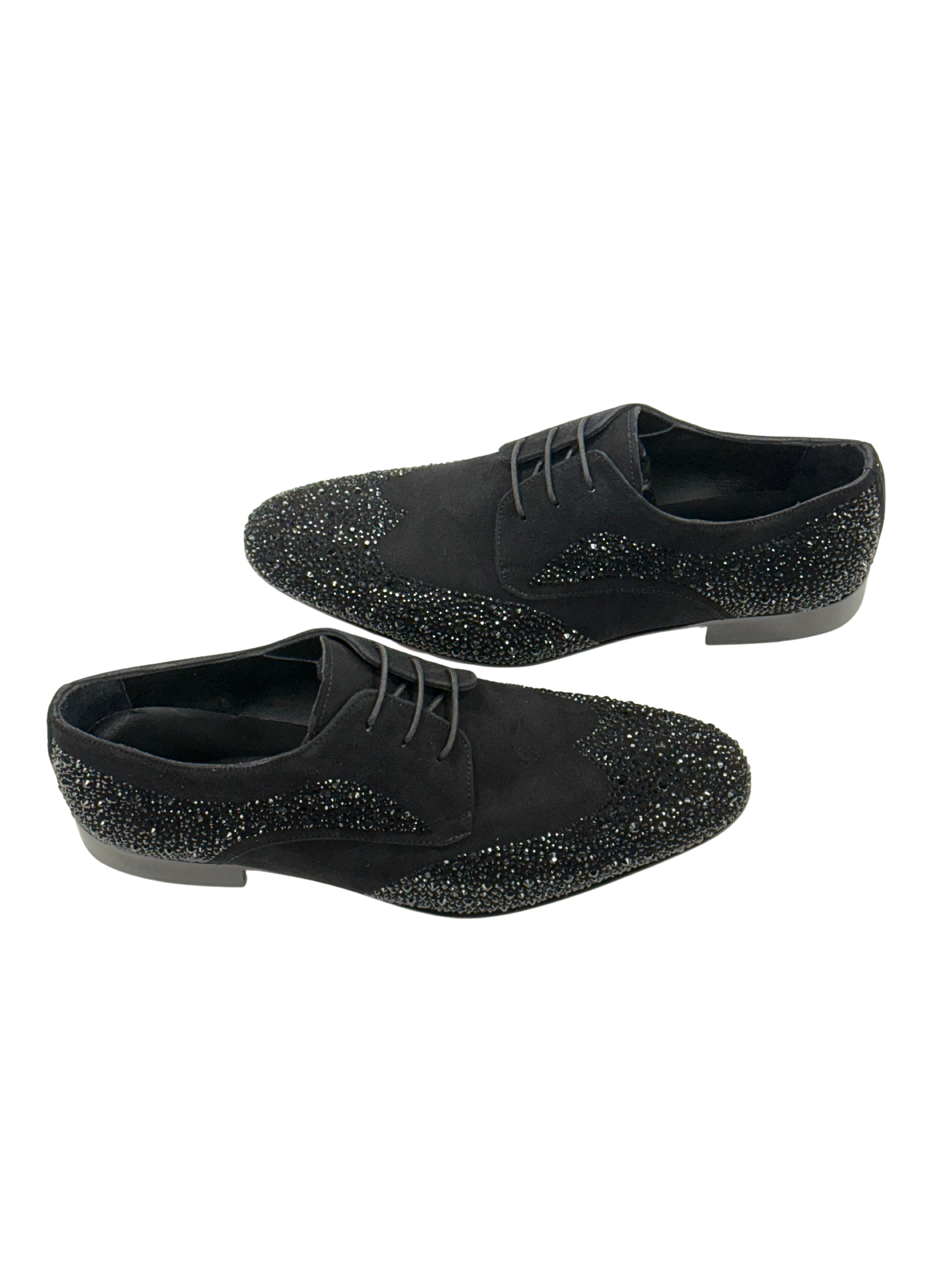 A black suede lace-up detailed with tonal black crystals across the toe, heel, and sides. Features a red leather sole and closed lacing for a sharp, formal silhouette.