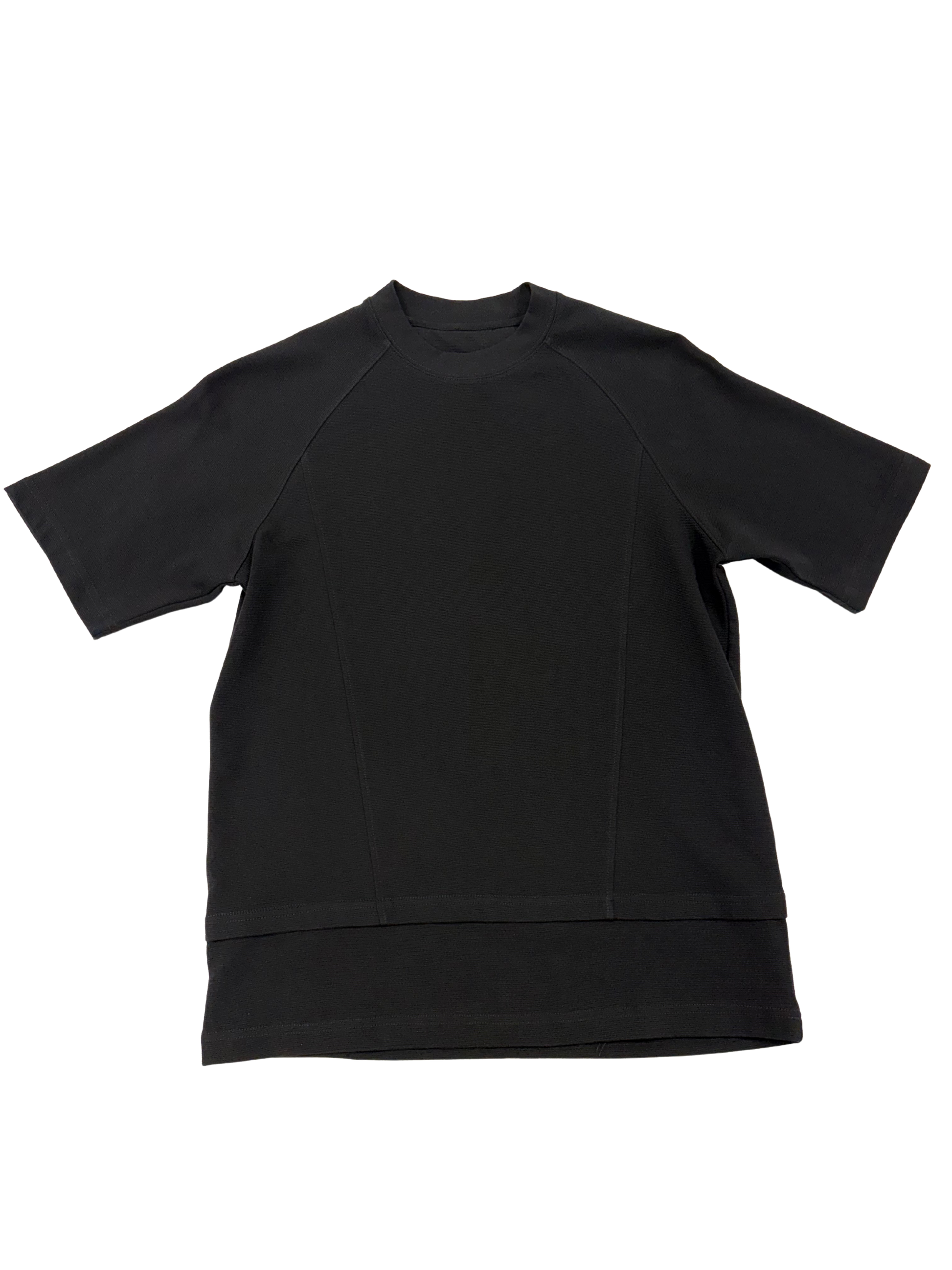 A standout silhouette built for clean layering. This paneled tee is crafted from a structured heavyweight cotton blend, with tonal ribbed textures and a double-layered hem effect that adds depth without bulk. Finished with a rubberized patch at the back neck for a subtle branded touch. Sharp, directional, and versatile across seasons.