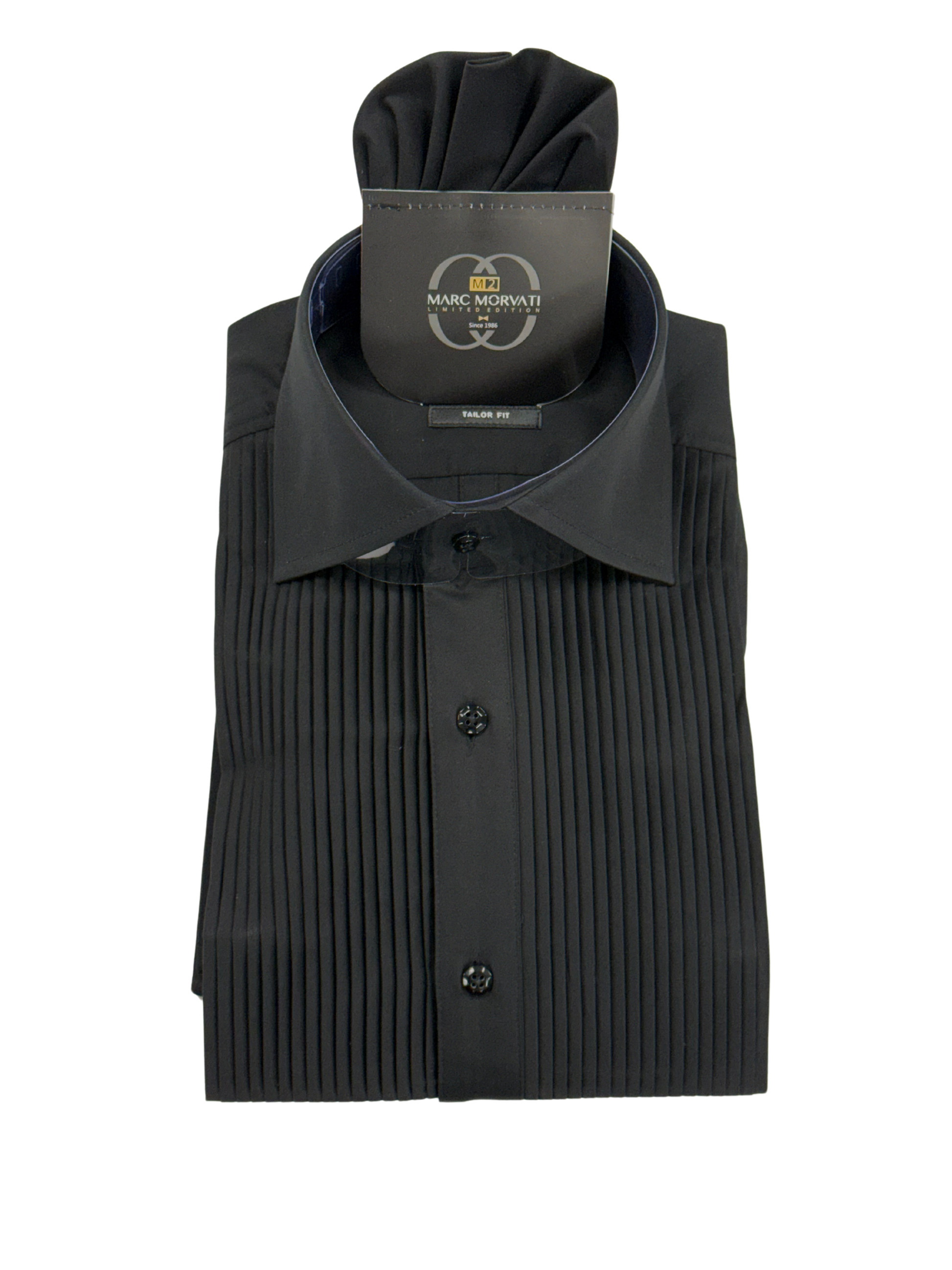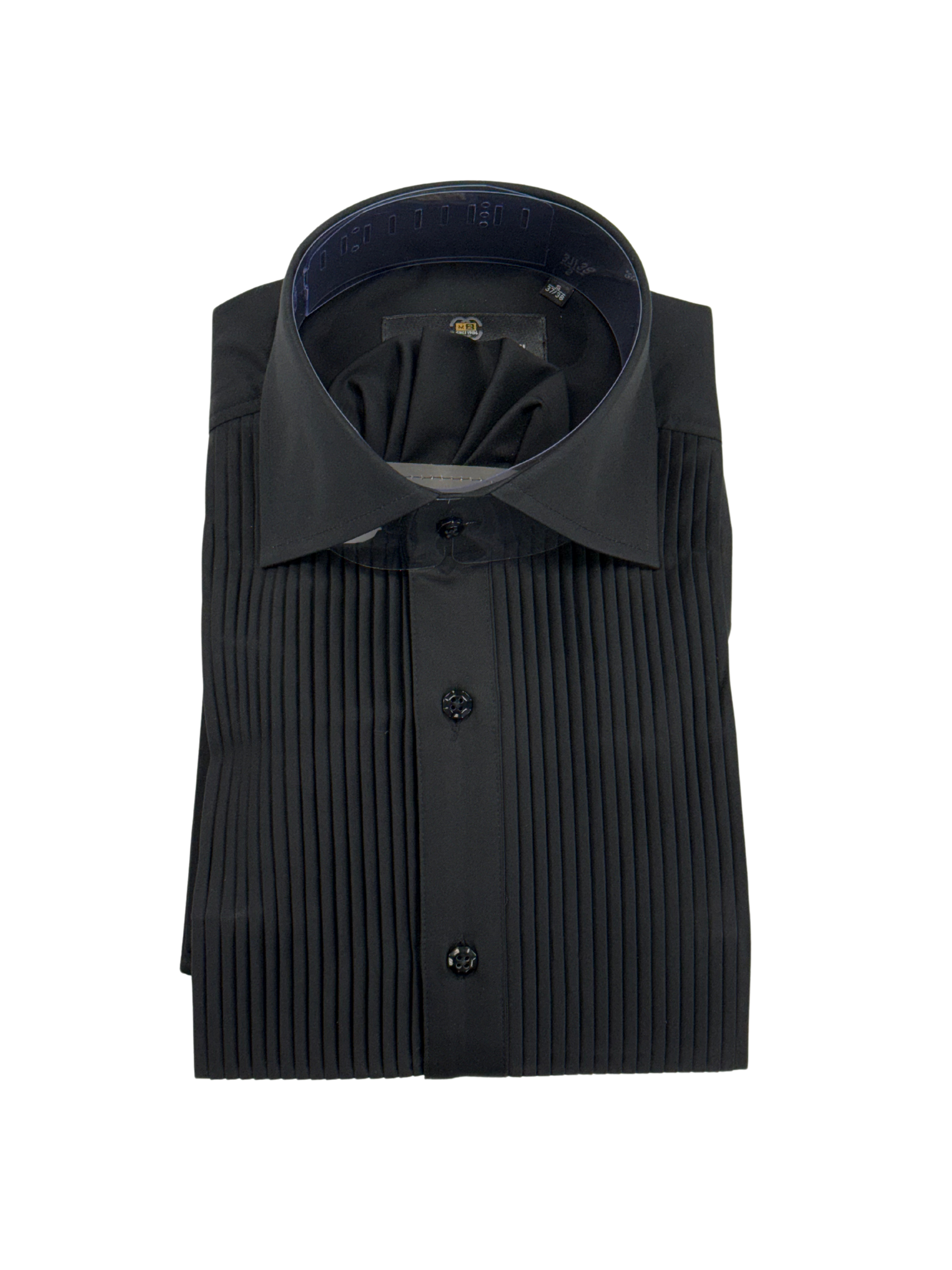 Crafted from 100% premium cotton, this black dress shirt features a pleated front panel and a tailored spread collar for an elevated, formal look. Includes a matching pocket square for a polished finish.
