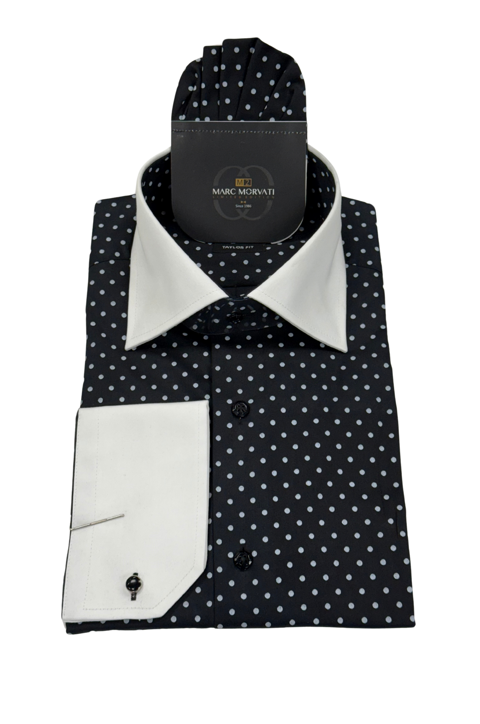 Crafted from 100% premium cotton, this black dress shirt features a white polka dot pattern with contrasting white collar and cuffs. Includes a matching pocket square for a polished look, and is finished with black button accents and a tailored spread collar.