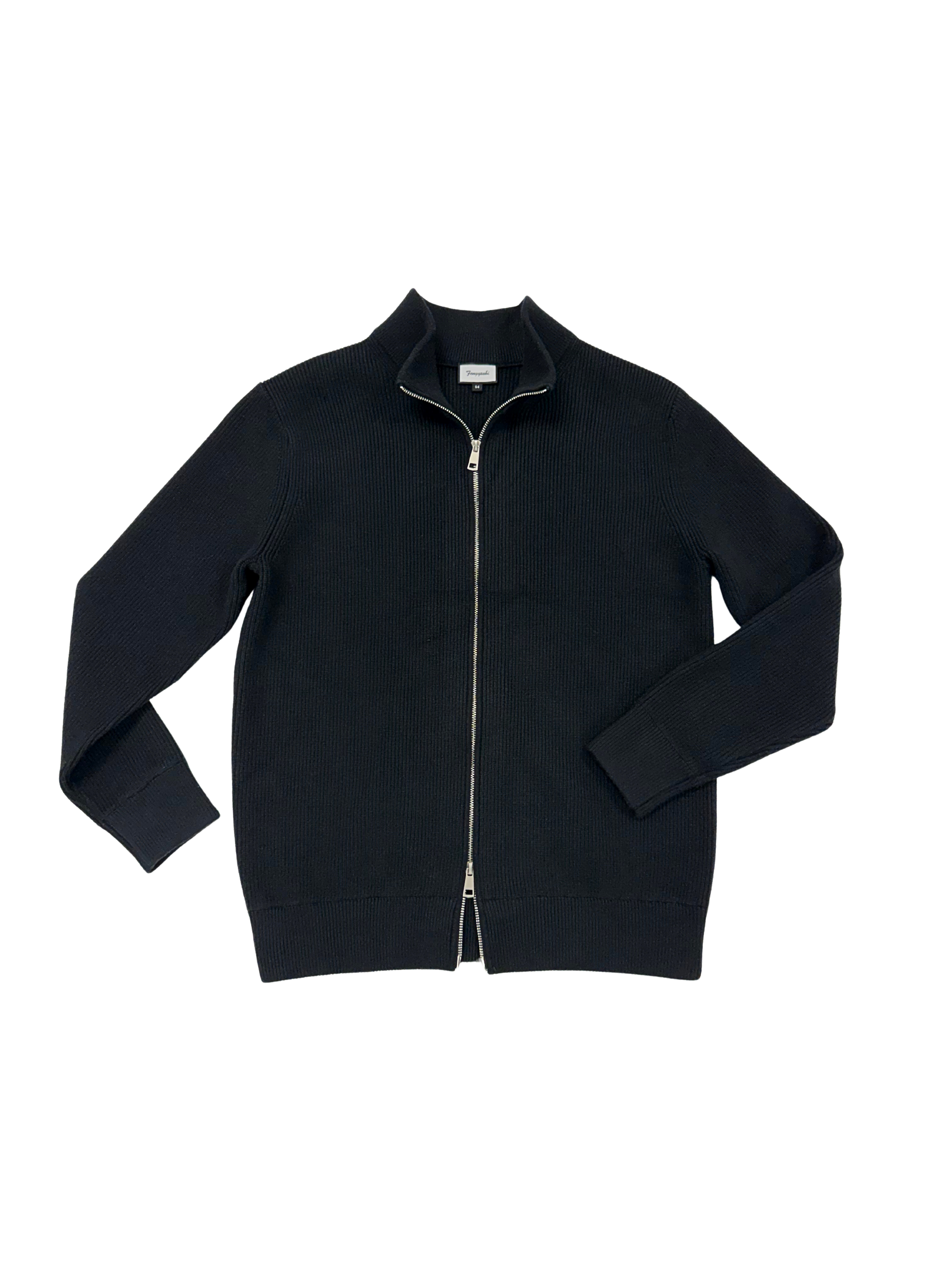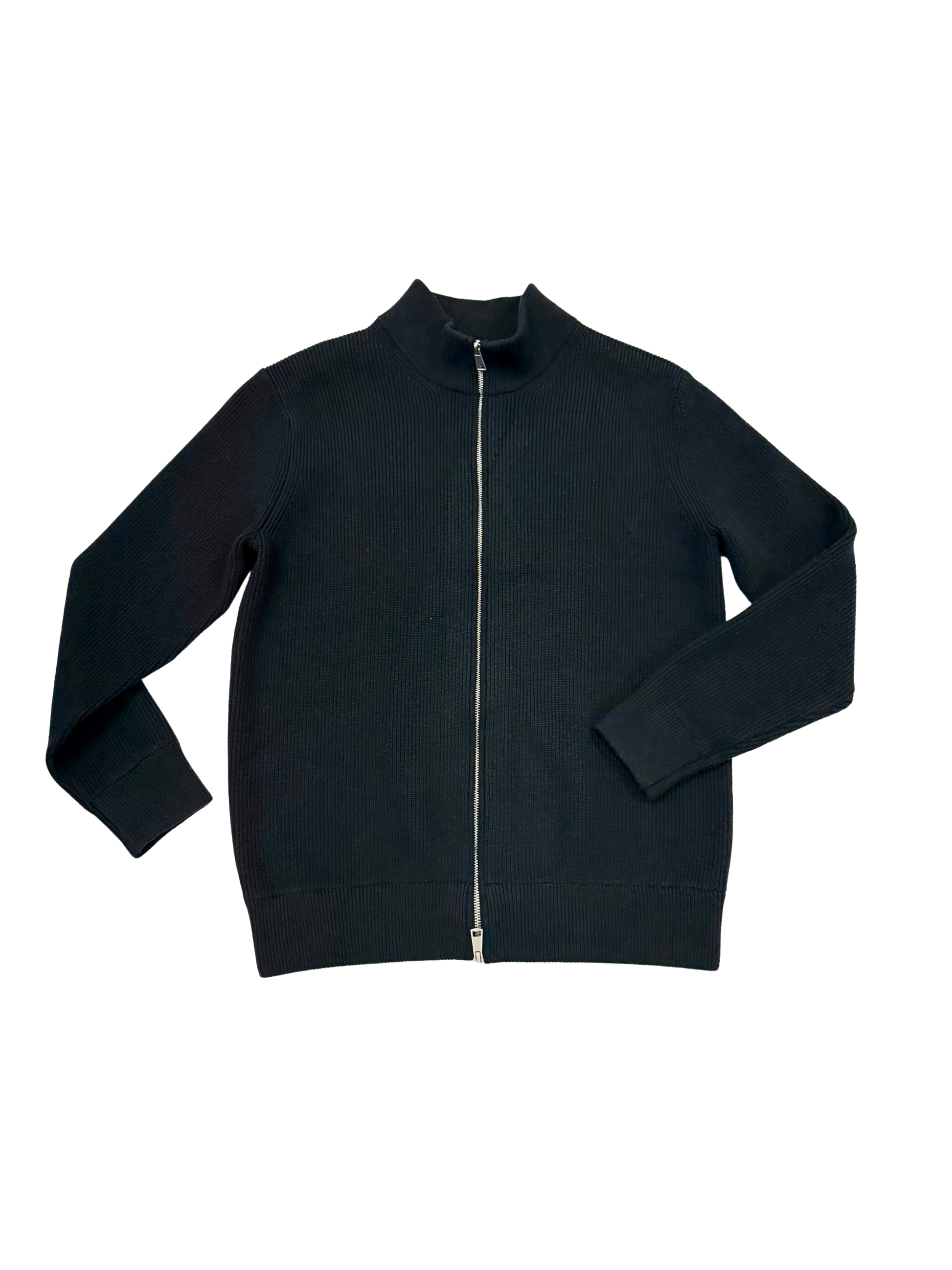 A refined wool-cotton blend defined by clean vertical ribbing and a polished two-way zip. Lightweight yet structured, it offers a sharp silhouette and effortless layering for any season.