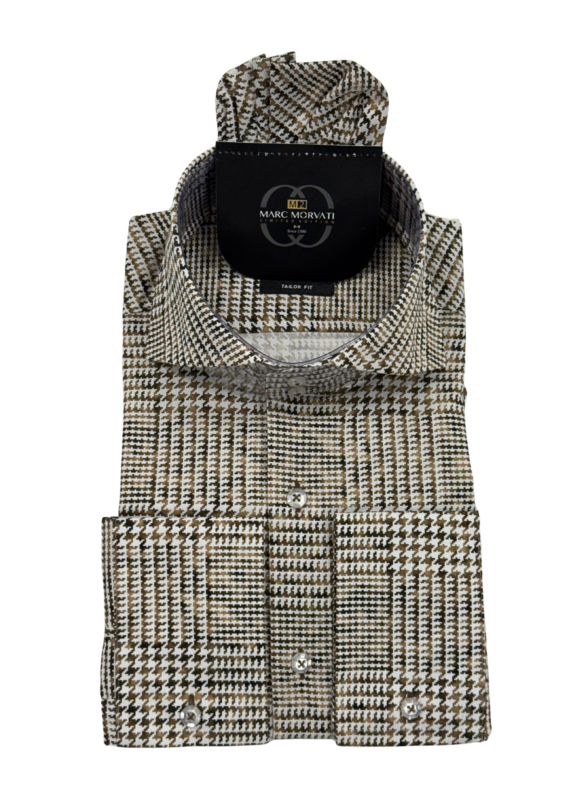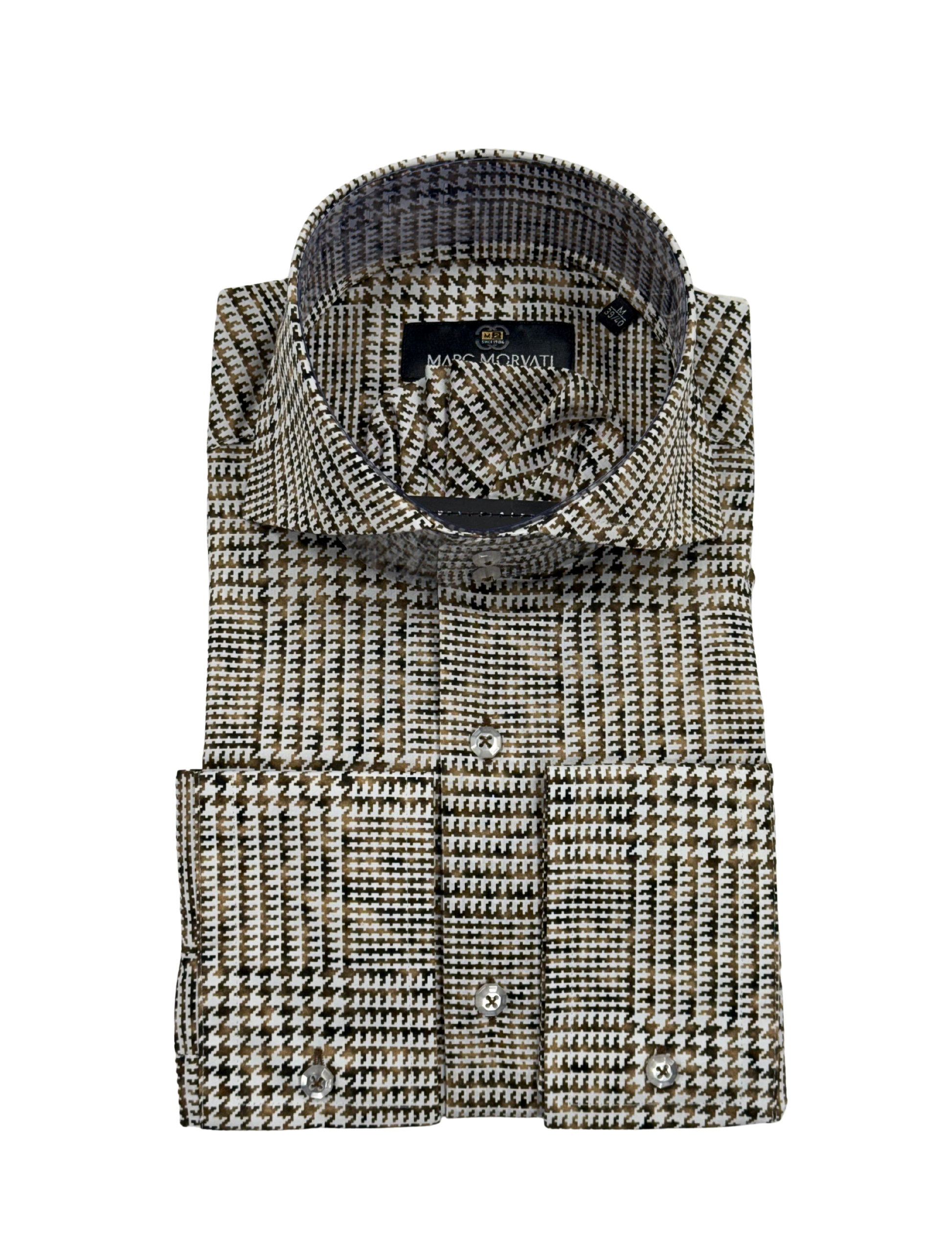 Crafted from 100% premium cotton, this brown and white fine houndstooth dress shirt features a tailored spread collar, refined button detailing, and a sharp, modern silhouette. Includes a matching pocket square for a polished, coordinated look.