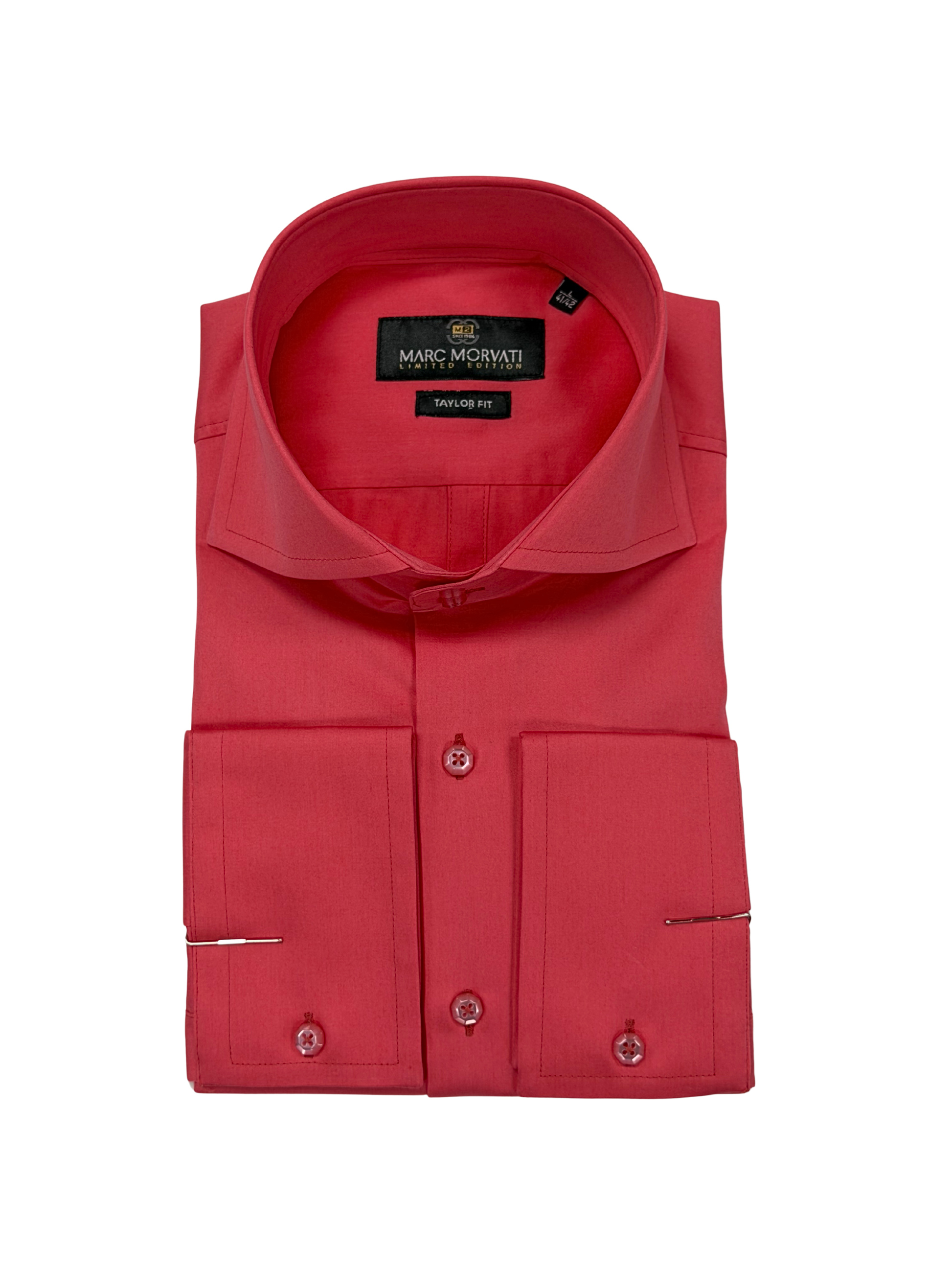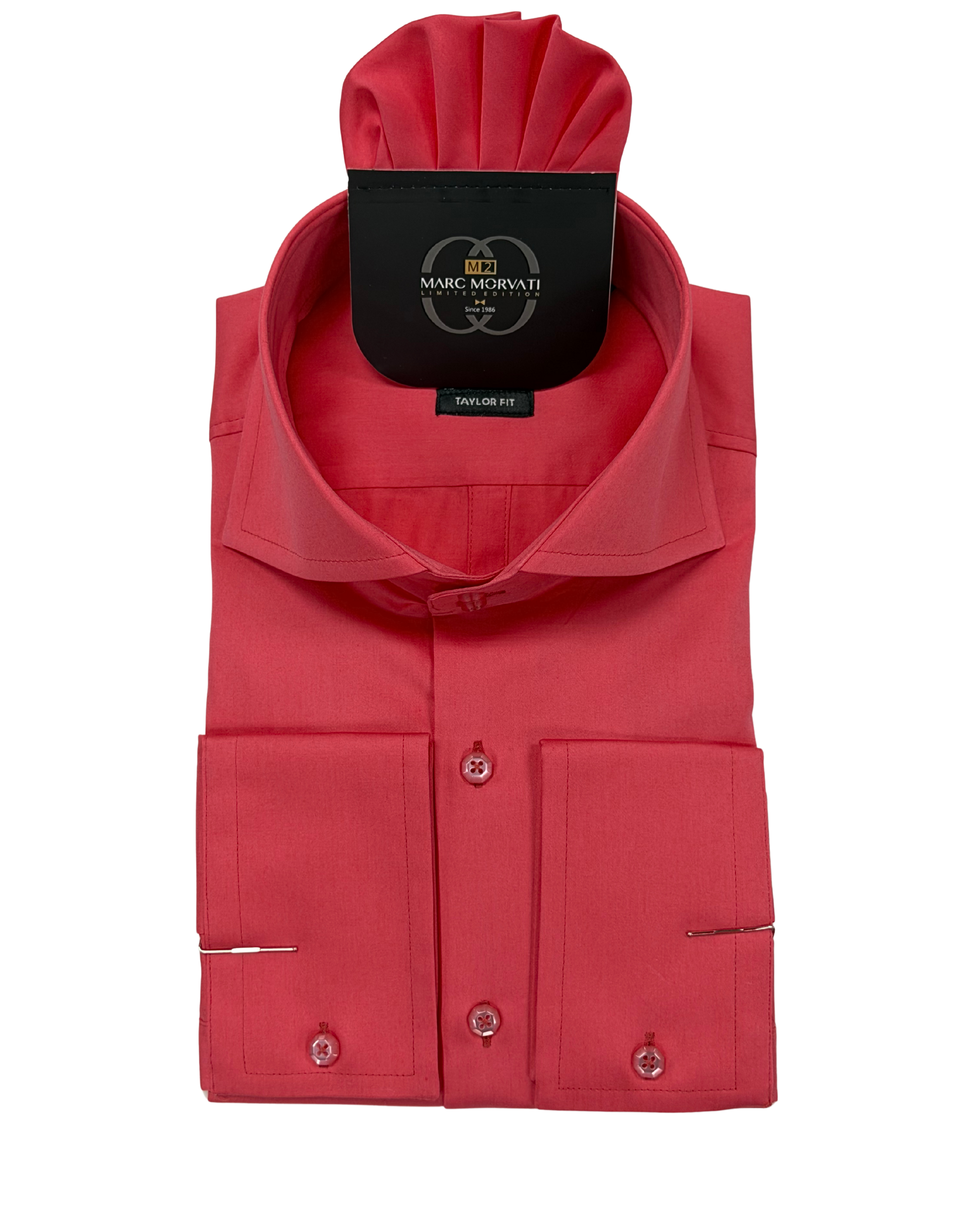 Crafted from 100% premium cotton, this coral pink dress shirt features tonal button accents and a tailored spread collar. Includes a matching pocket square for a polished, modern look.