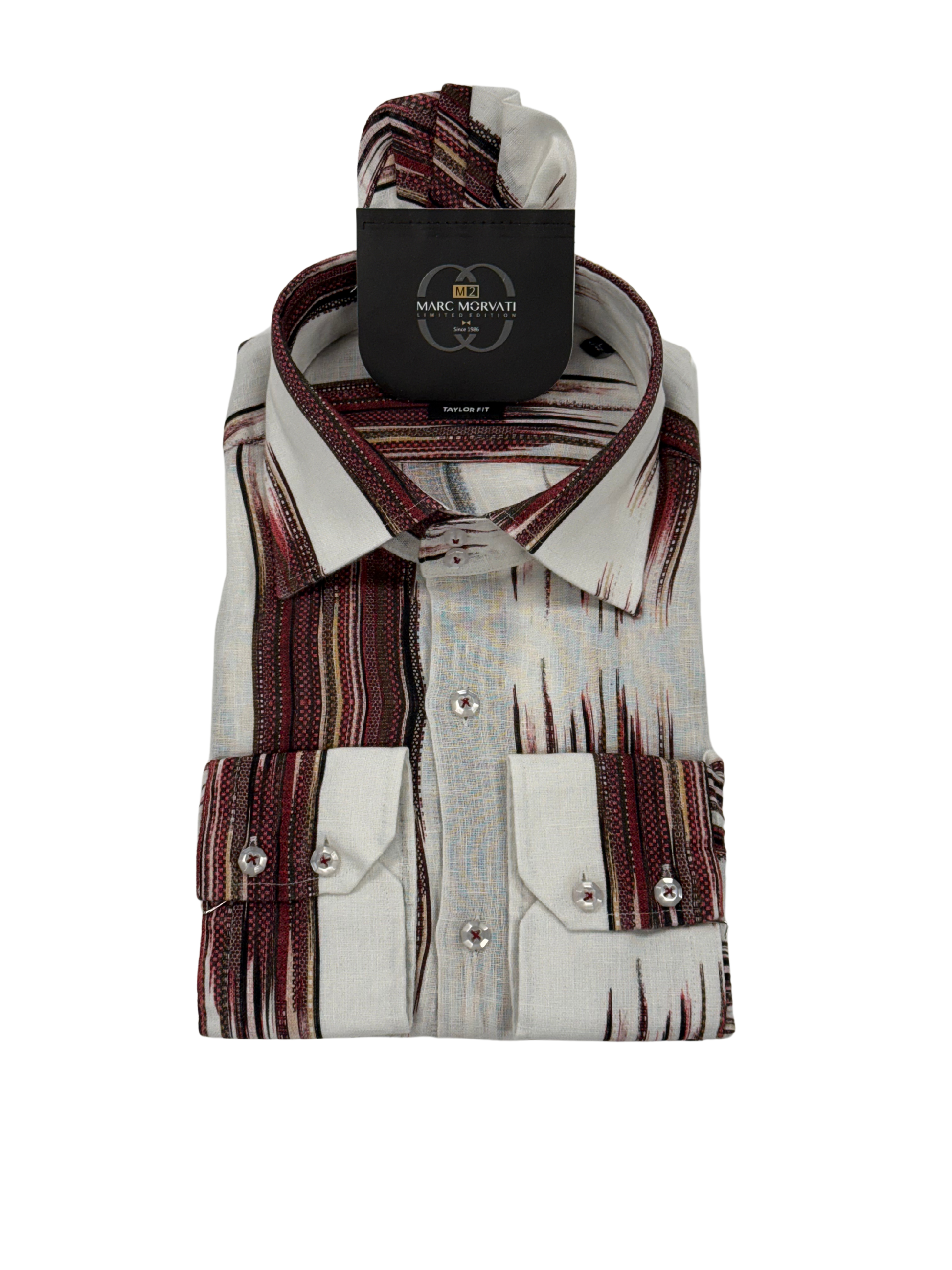 Crafted from a breathable linen blend, this statement shirt features deep crimson and black streaked stripes on an off-white base for a bold, artistic look. Finished with flap chest pockets, tonal buttons, and a tailored spread collar. Includes a matching pocket square.