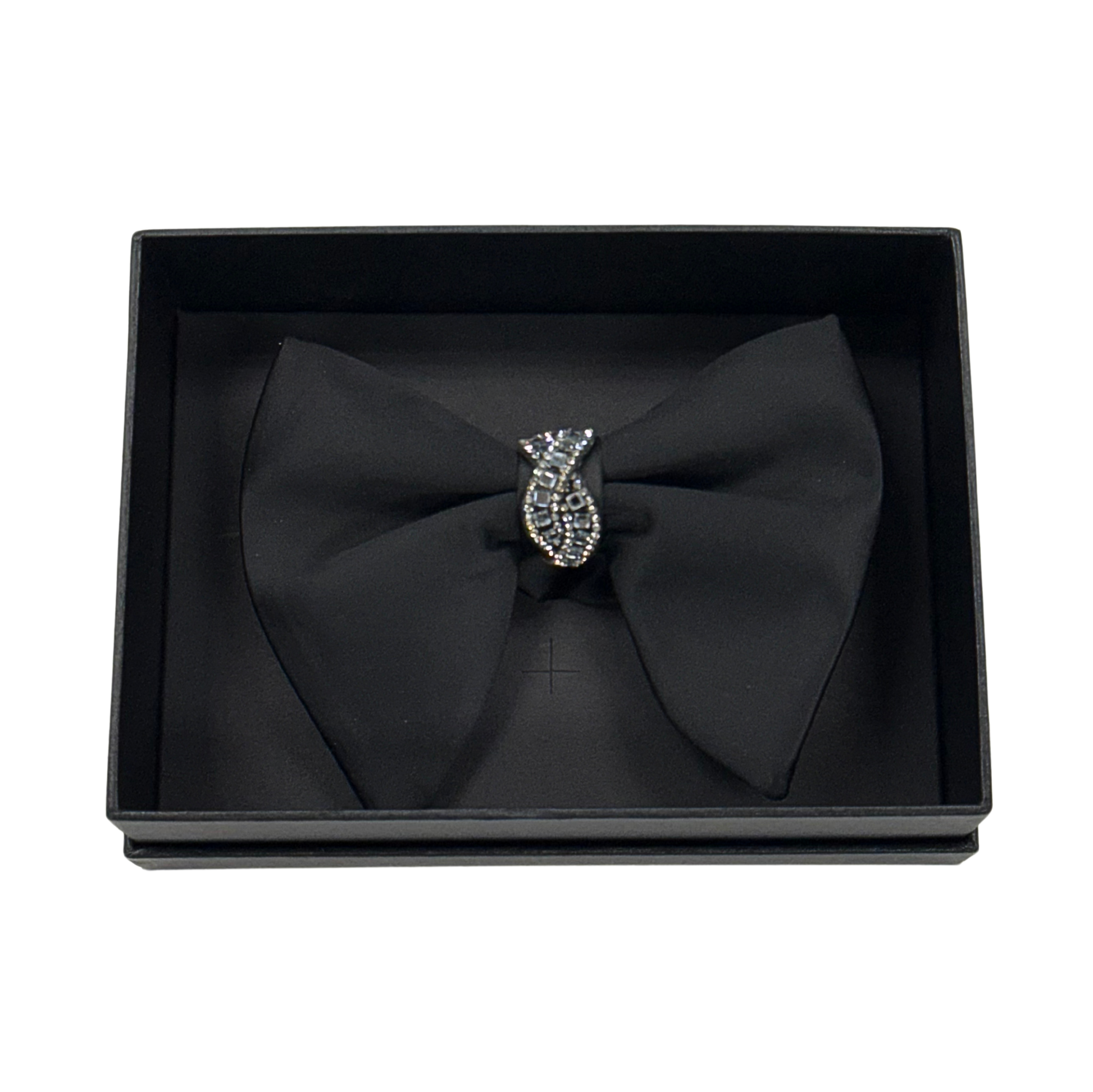 Satin-finish black fabric in a structured silhouette, detailed with a crystal centerpiece. A sleek, sculpted piece with a refined touch of shine. Finished with an adjustable strap for a tailored fit.