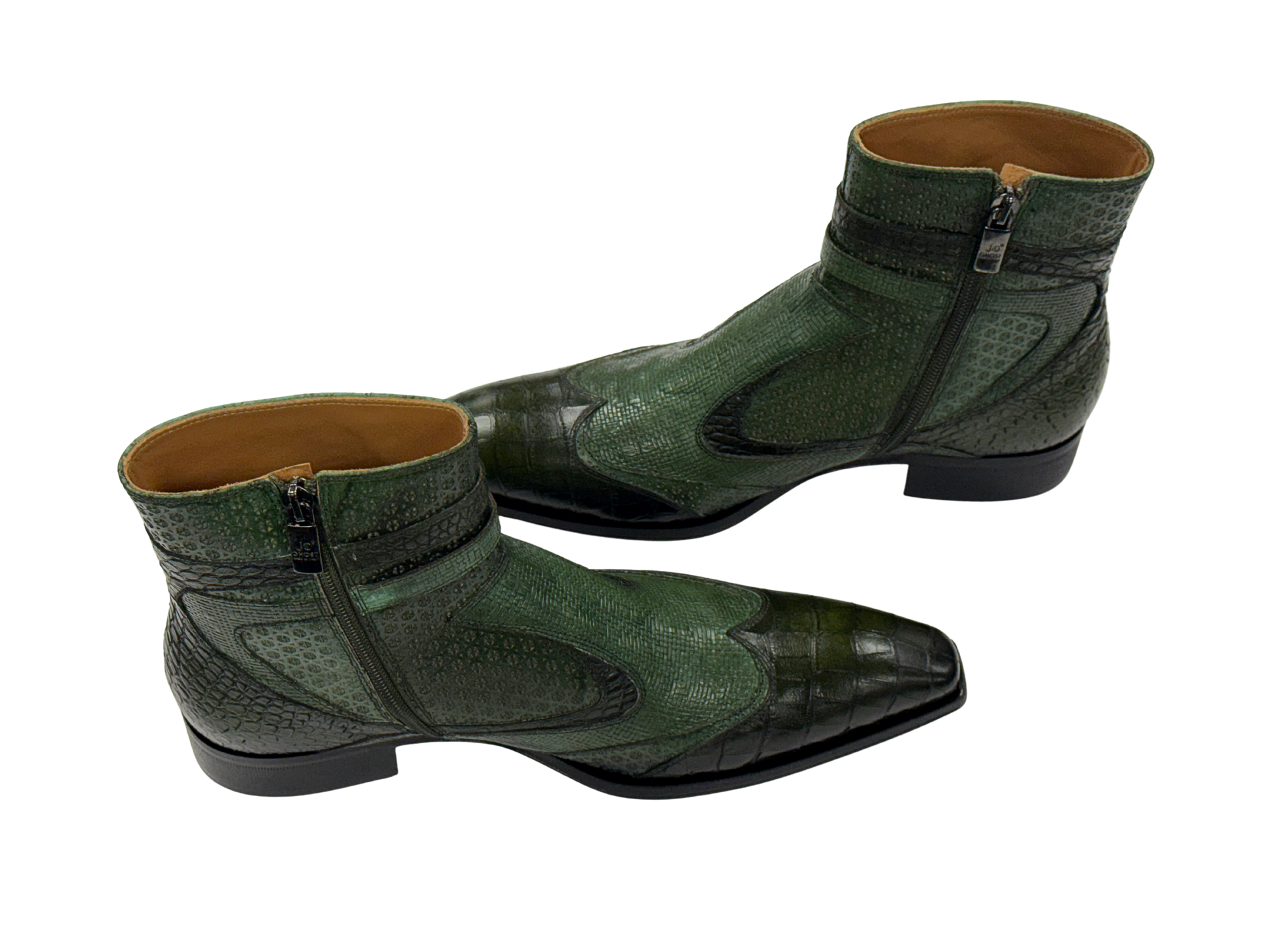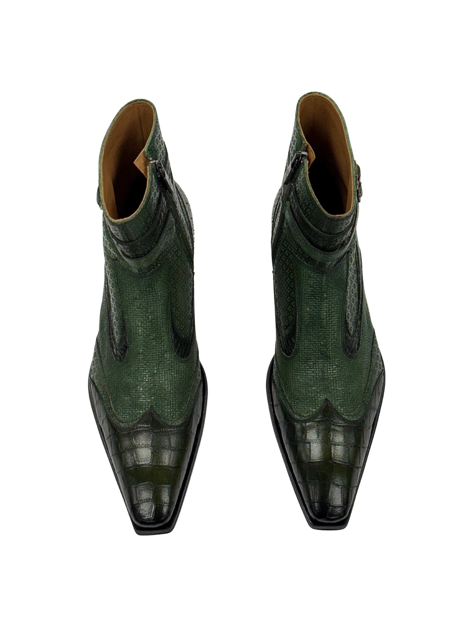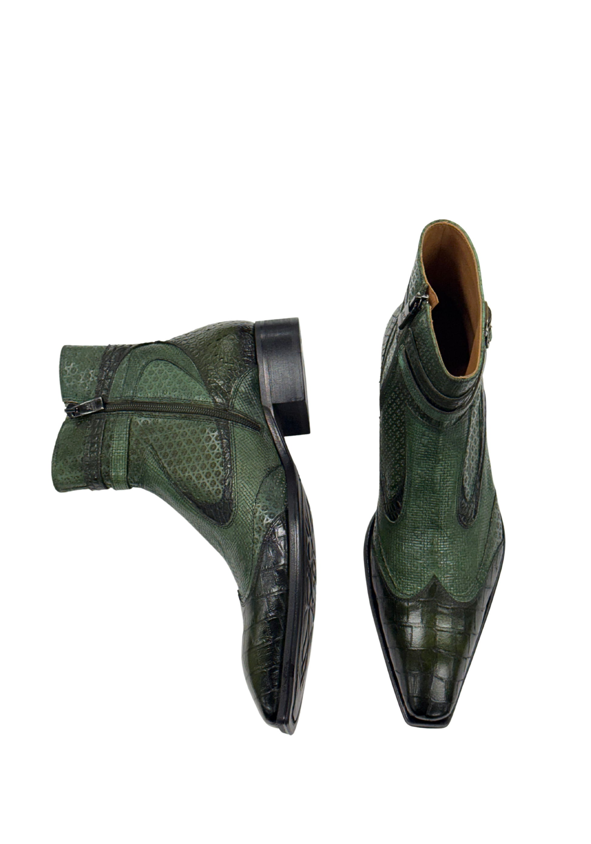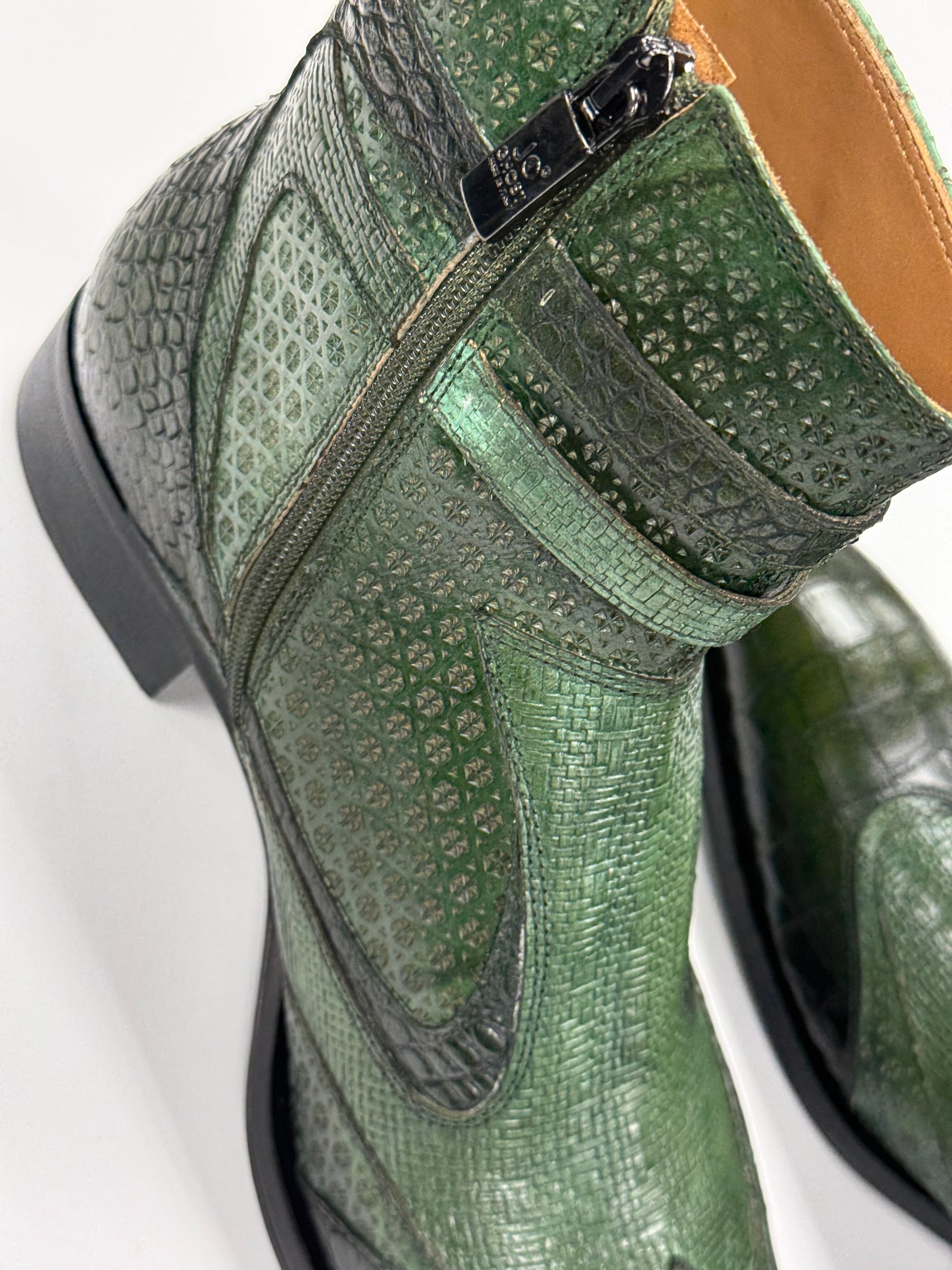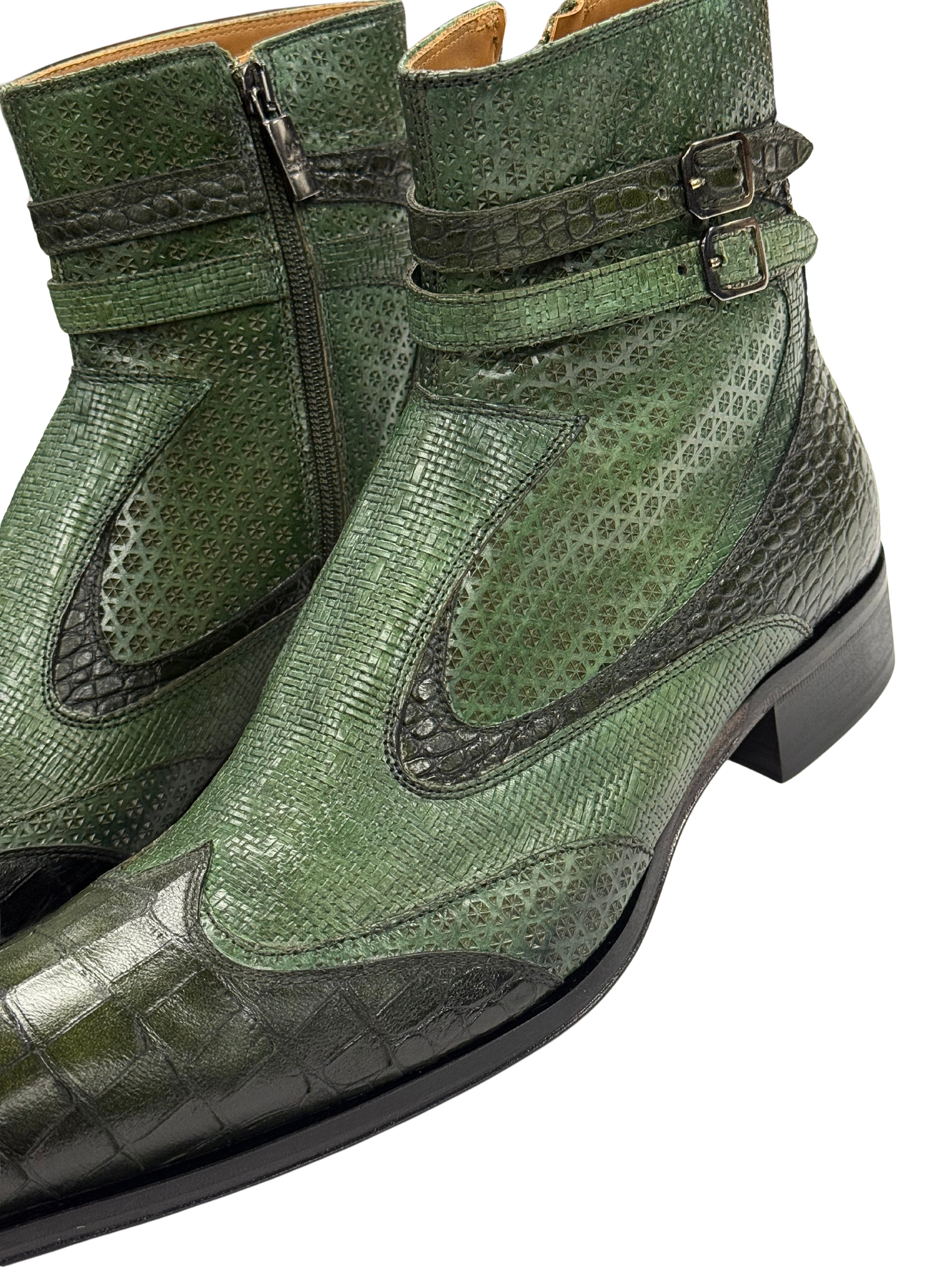 Crafted in Italy by Jo Ghost from 100% Italian leather, these green boots feature python-embossed panels, croc-patterned toe caps, and dual side buckles for a bold, textured finish. Complete with a pointed toe and side zip, they deliver standout character with refined structure and sharp edge.