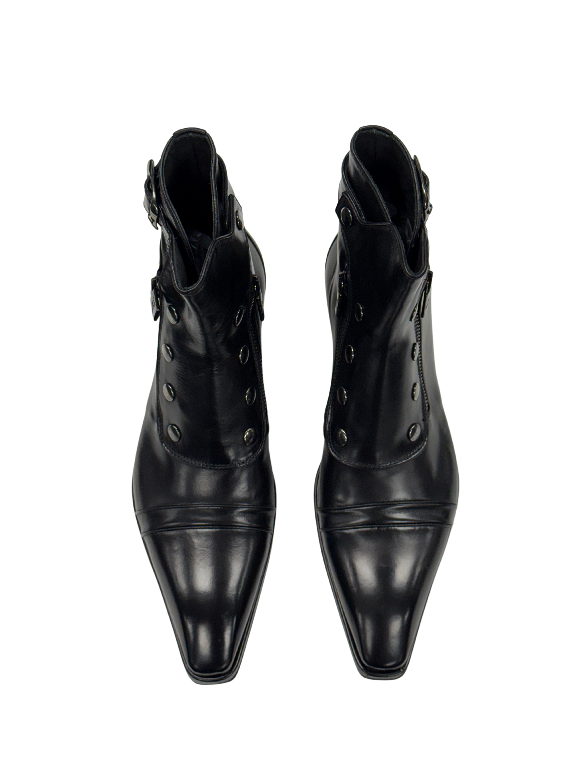 Crafted in Italy by Jo Ghost from 100% premium leather, these black boots feature a pointed toe, side zip, and silver-tone button and buckle detailing for a sharp, modern edge. Built for standout looks with refined structure and luxury finish.