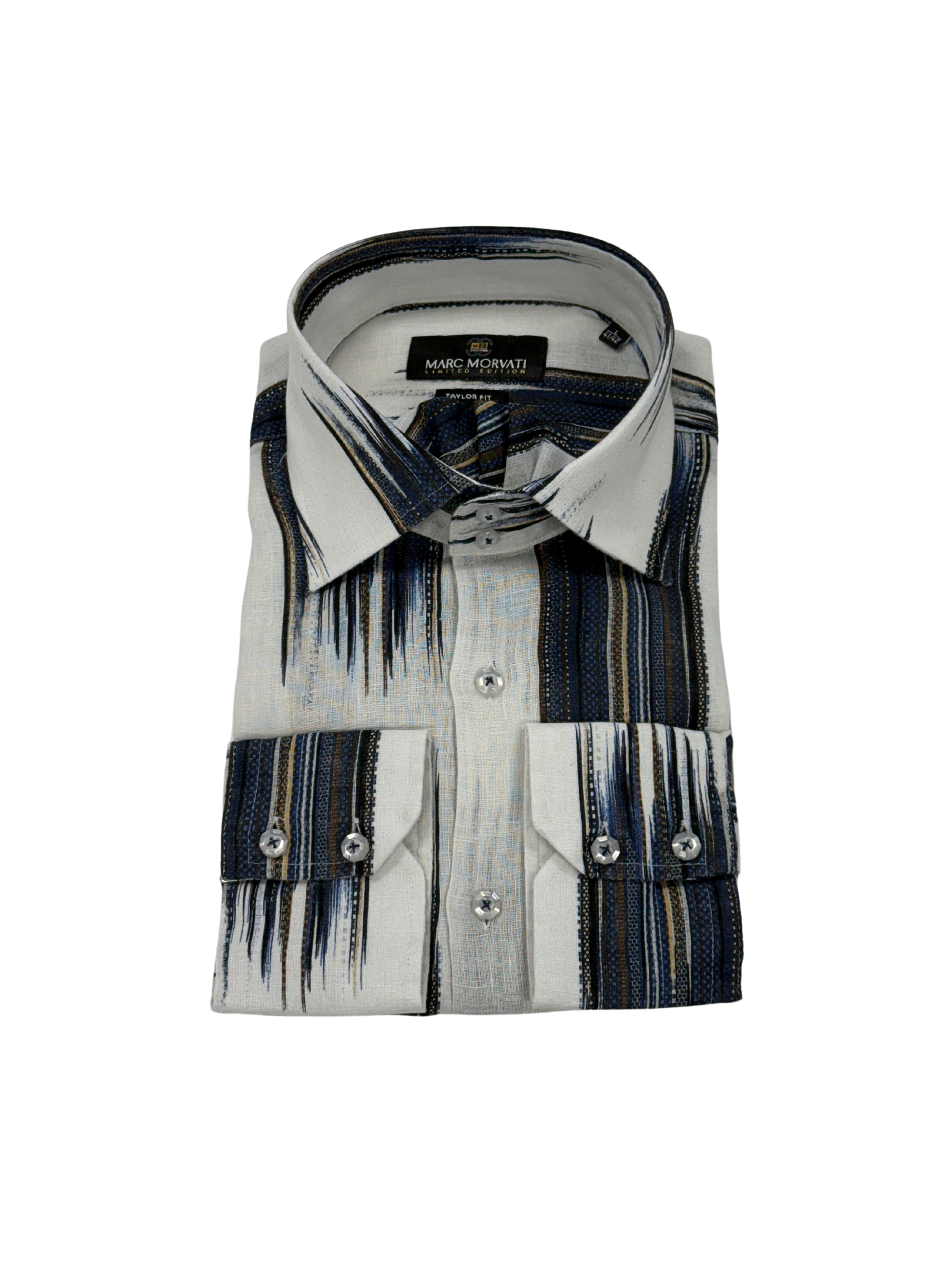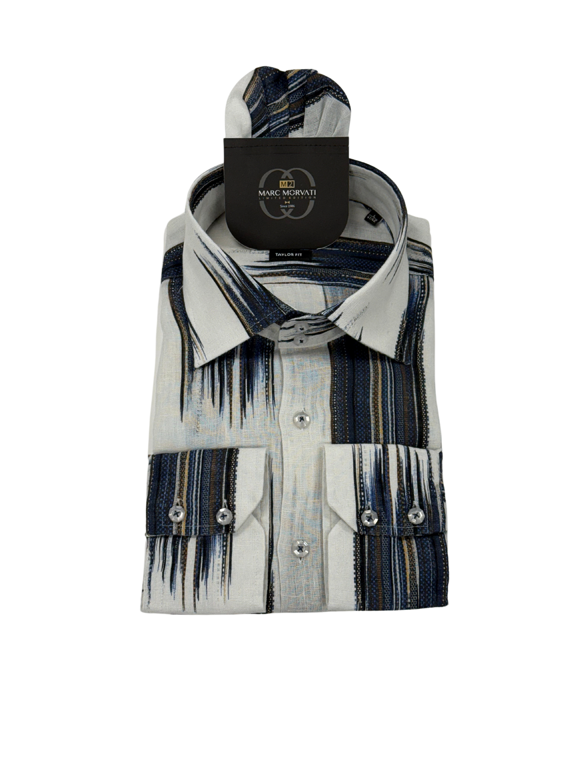 Crafted from a breathable linen blend, this striking shirt features deep navy and charcoal streaked stripes on a soft off-white base. Finished with flap chest pockets, tonal buttons, and a tailored spread collar. Includes a matching pocket square.