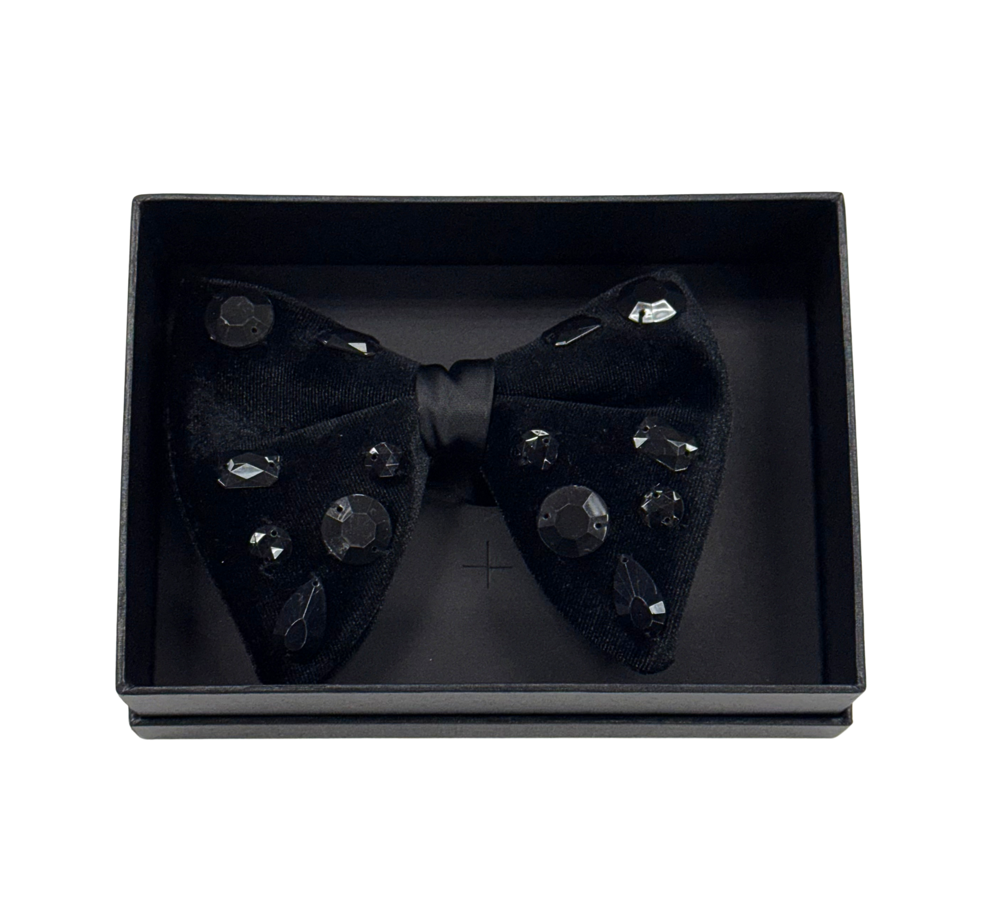 Plush black velvet, hand-embellished with faceted black stones for tonal depth and texture. A bold, dramatic accent built for evening statements. Finished with an adjustable strap for a tailored fit.