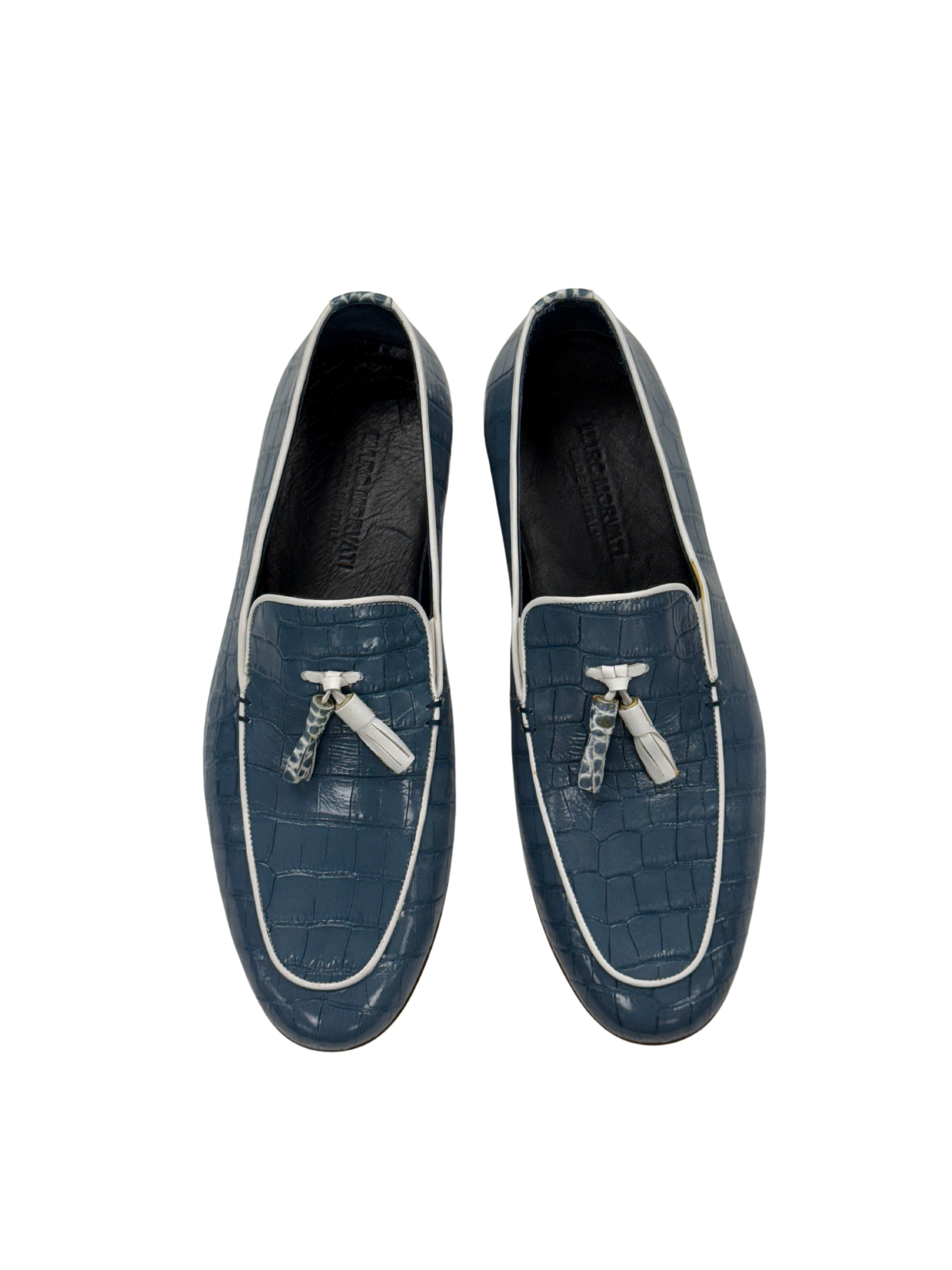 Crafted in Italy from 100% premium textured leather, these loafers deliver effortless style and all-day comfort. Finished in a refined ocean blue with white piping and tassel detail, they’re a clean, elevated choice for any summer look.