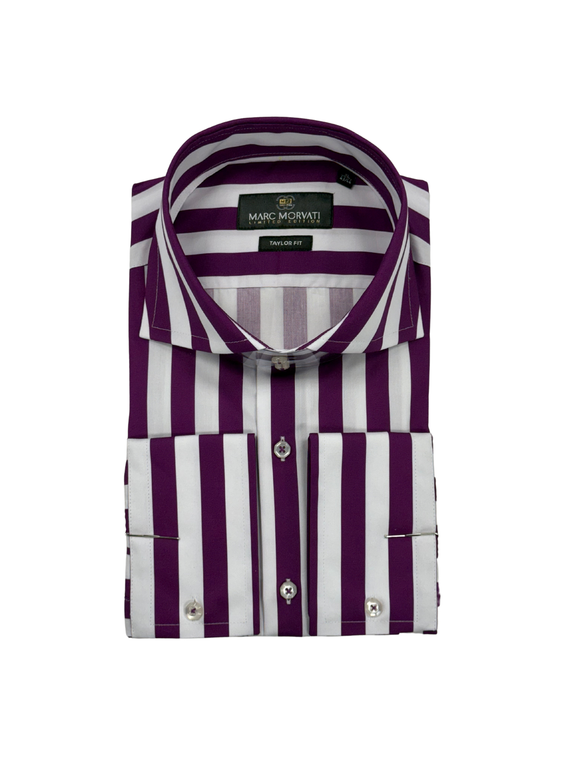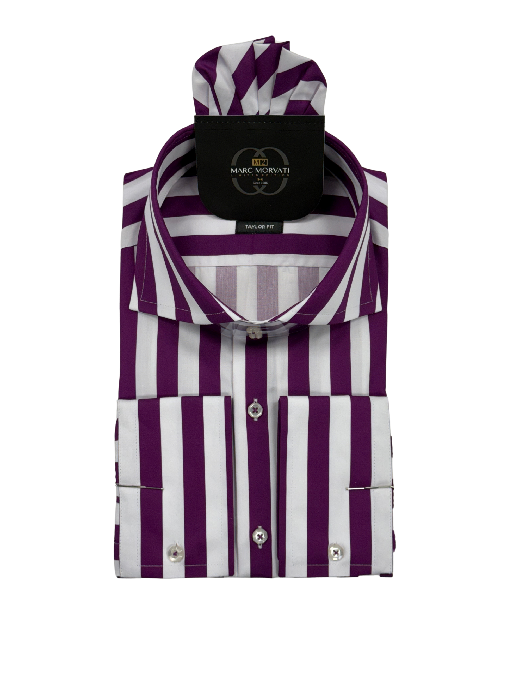 Crafted from 100% premium cotton, this white and purple striped dress shirt features bold vertical stripes, polished silver-tone cuff accents, and a tailored spread collar. Includes a matching pocket square for a refined, modern look.