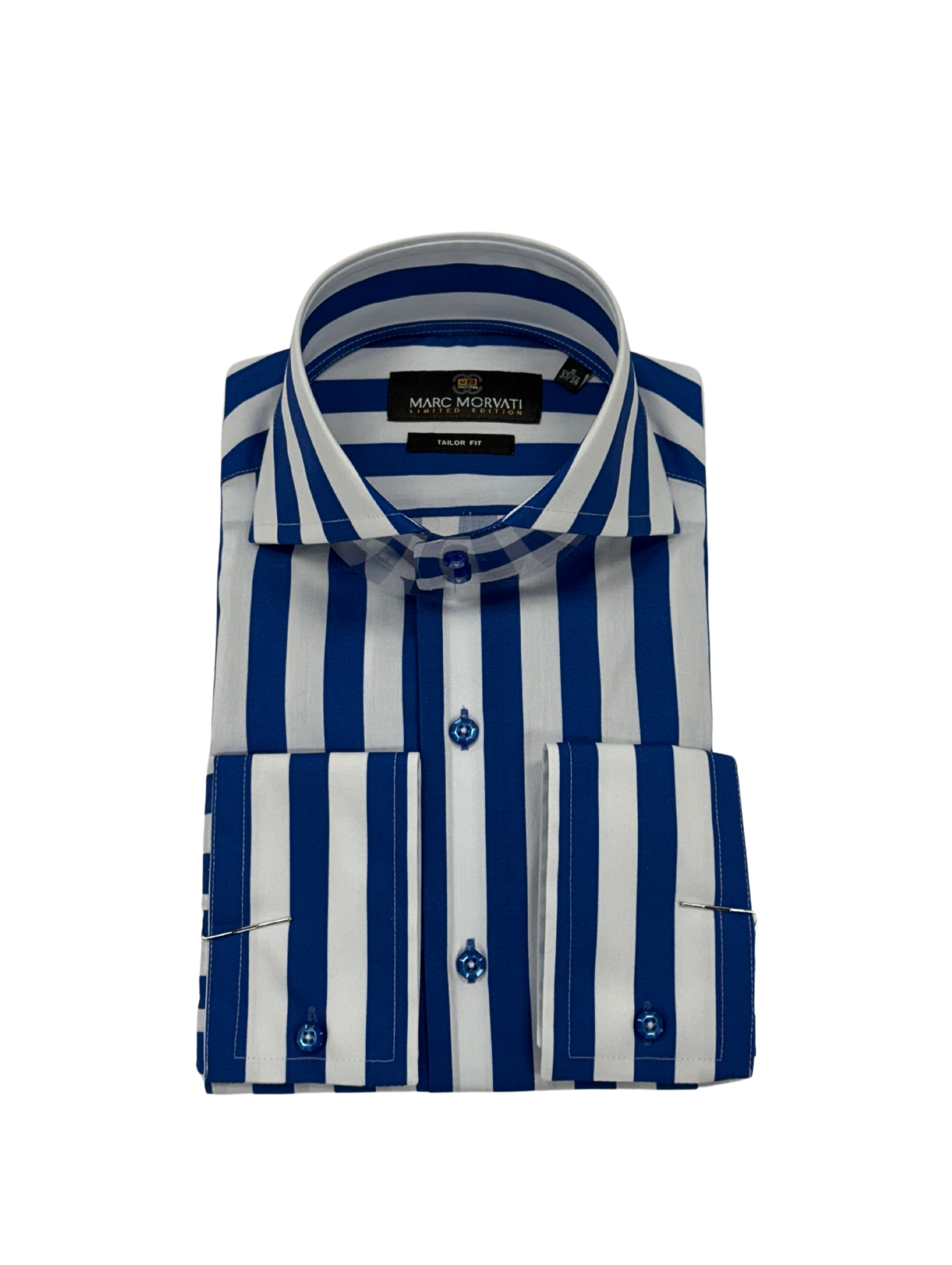 Crafted from 100% premium cotton, this white and royal blue striped dress shirt features bold vertical stripes, tonal button accents, and a tailored spread collar. Includes a matching pocket square for a polished, modern look.