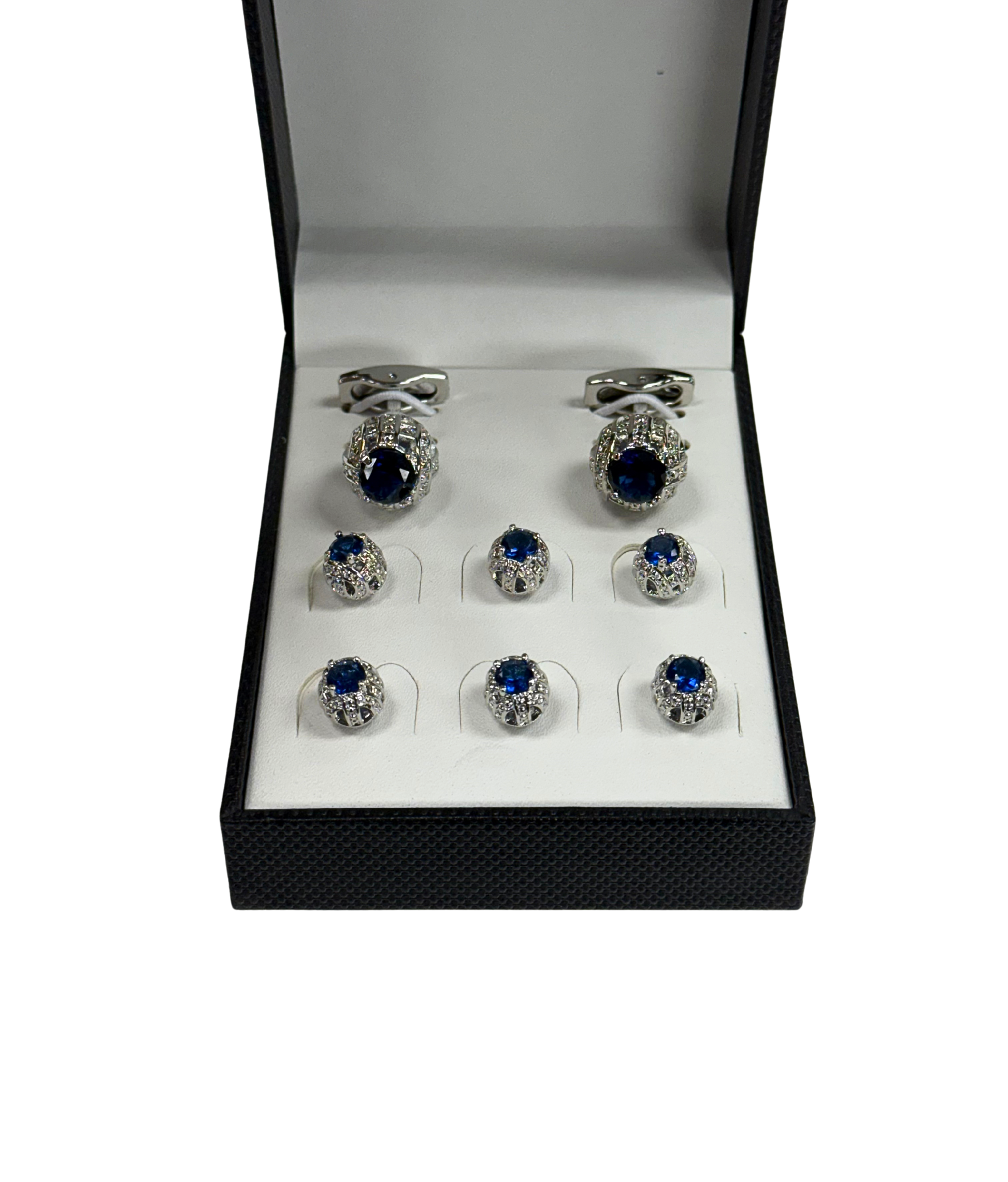 A distinguished formal set featuring silver-tone cufflinks and six matching shirt studs, each set with deep sapphire-blue stones wrapped in crystal-accented crowns. A statement look for black tie dressing.
