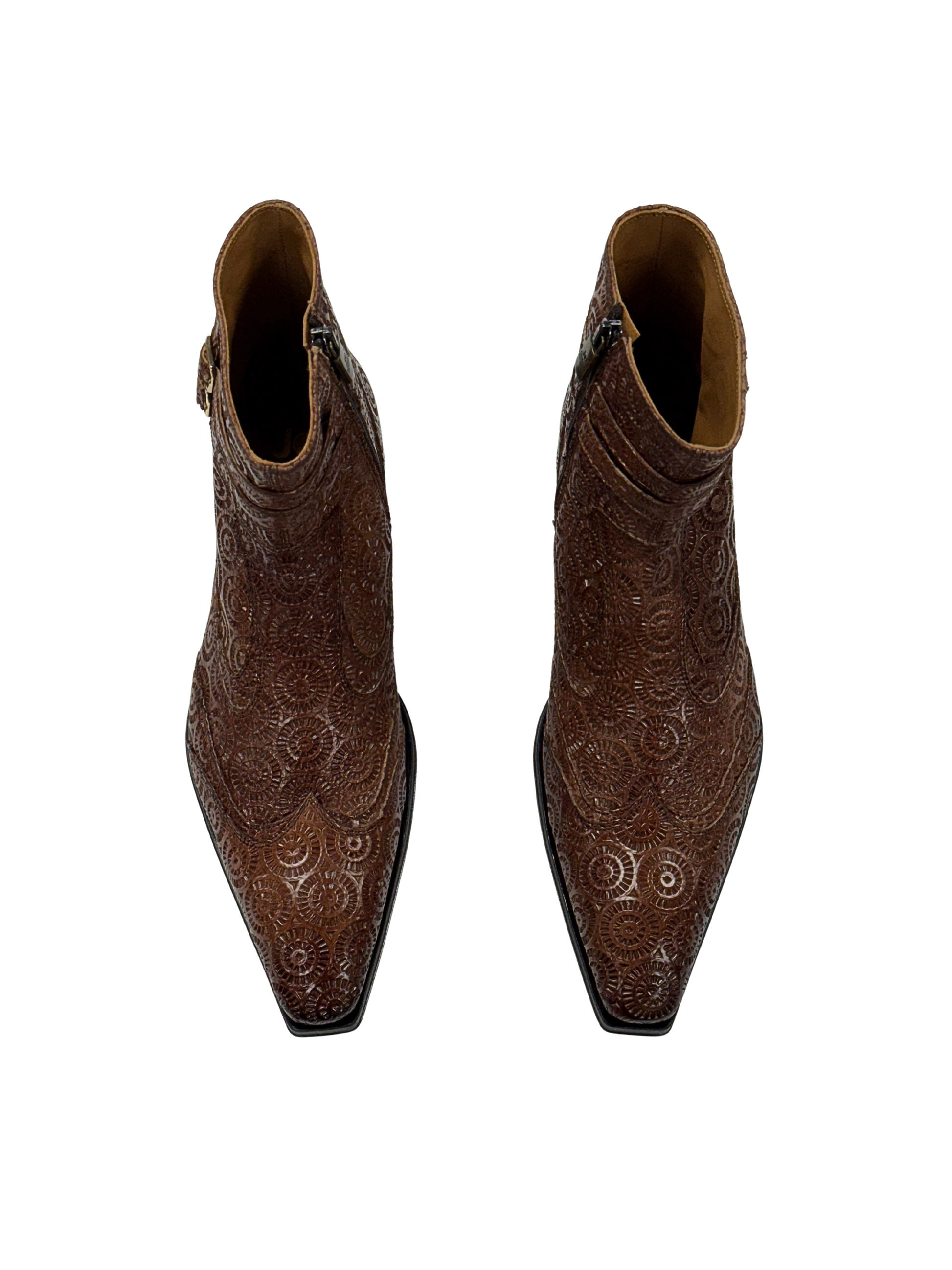 Crafted in Italy from 100% premium leather, these statement brown boots by Jo Ghost showcase an intricate spiral-engraved texture across their sharp silhouette. Featuring a sleek pointed toe, dual side buckles, and an inner zip for refined ease, this design balances bold craftsmanship with classic Italian edge. A distinguished pair built to turn heads with its sculpted detail and timeless appeal.