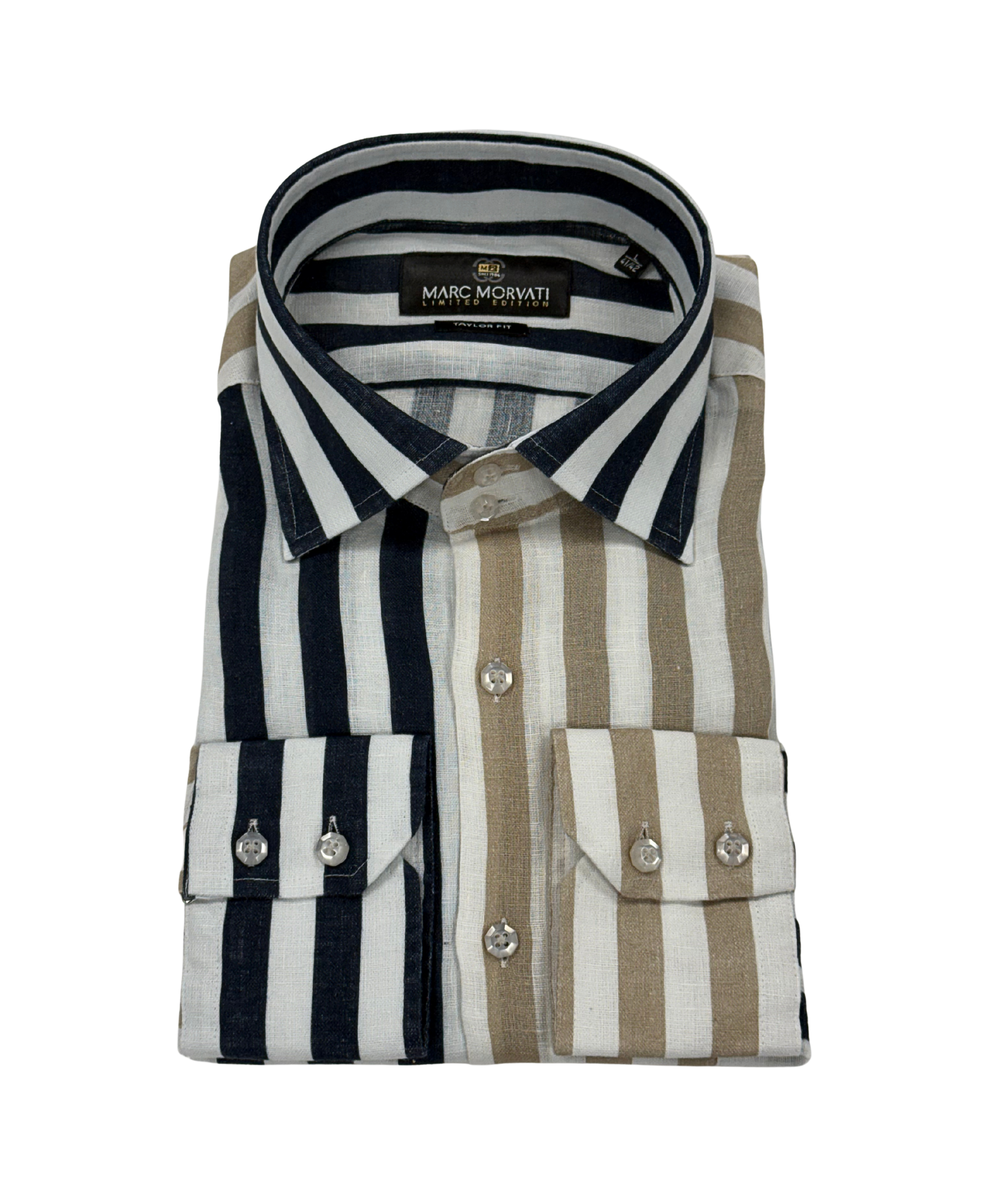Crafted from a breathable linen blend, this two-tone shirt features bold vertical stripes in navy and taupe, split evenly down the center. Finished with flap chest pockets and a tailored spread collar for a modern, relaxed look. Includes a matching pocket square.