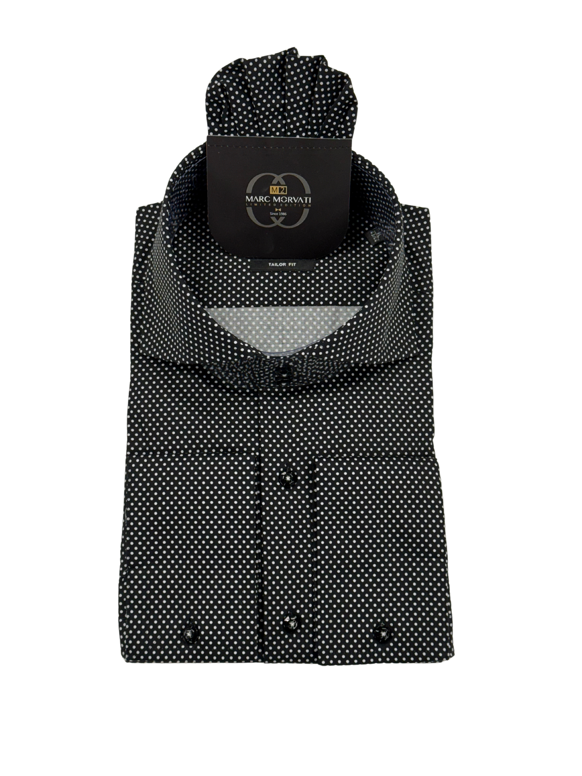 Crafted from 100% premium cotton, this black dress shirt features a subtle white polka dot pattern and a tailored spread collar. Includes a matching pocket square for a sharp, refined look.