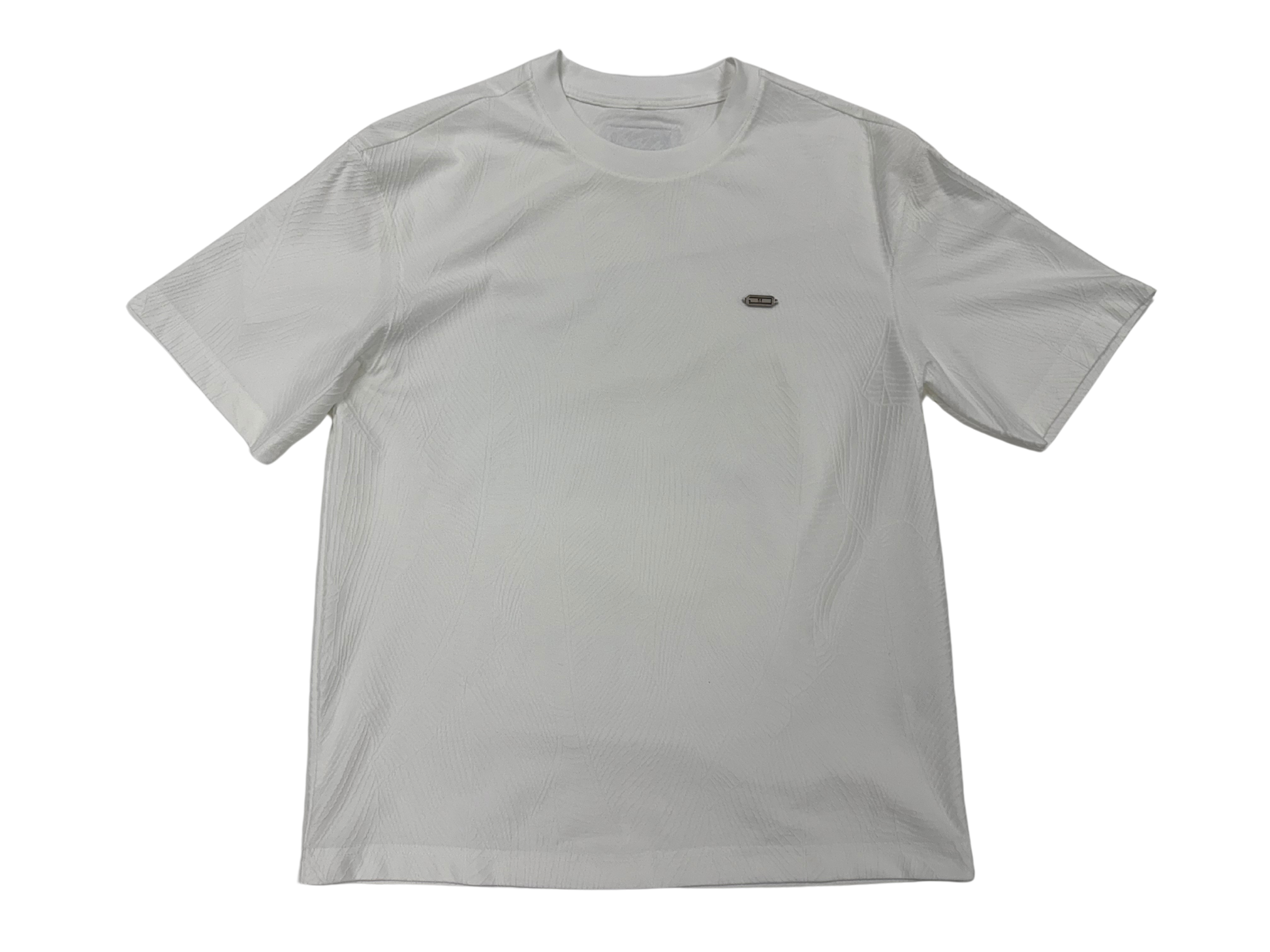A refined summer tee with elevated texture and clean lines. Crafted from a breathable cotton blend, this shirt features an intricate tonal weave that adds dimension without distraction. Finished with a minimalist metal logo badge at the chest for a subtle edge. Lightweight, versatile, and effortless — a modern warm-weather essential.