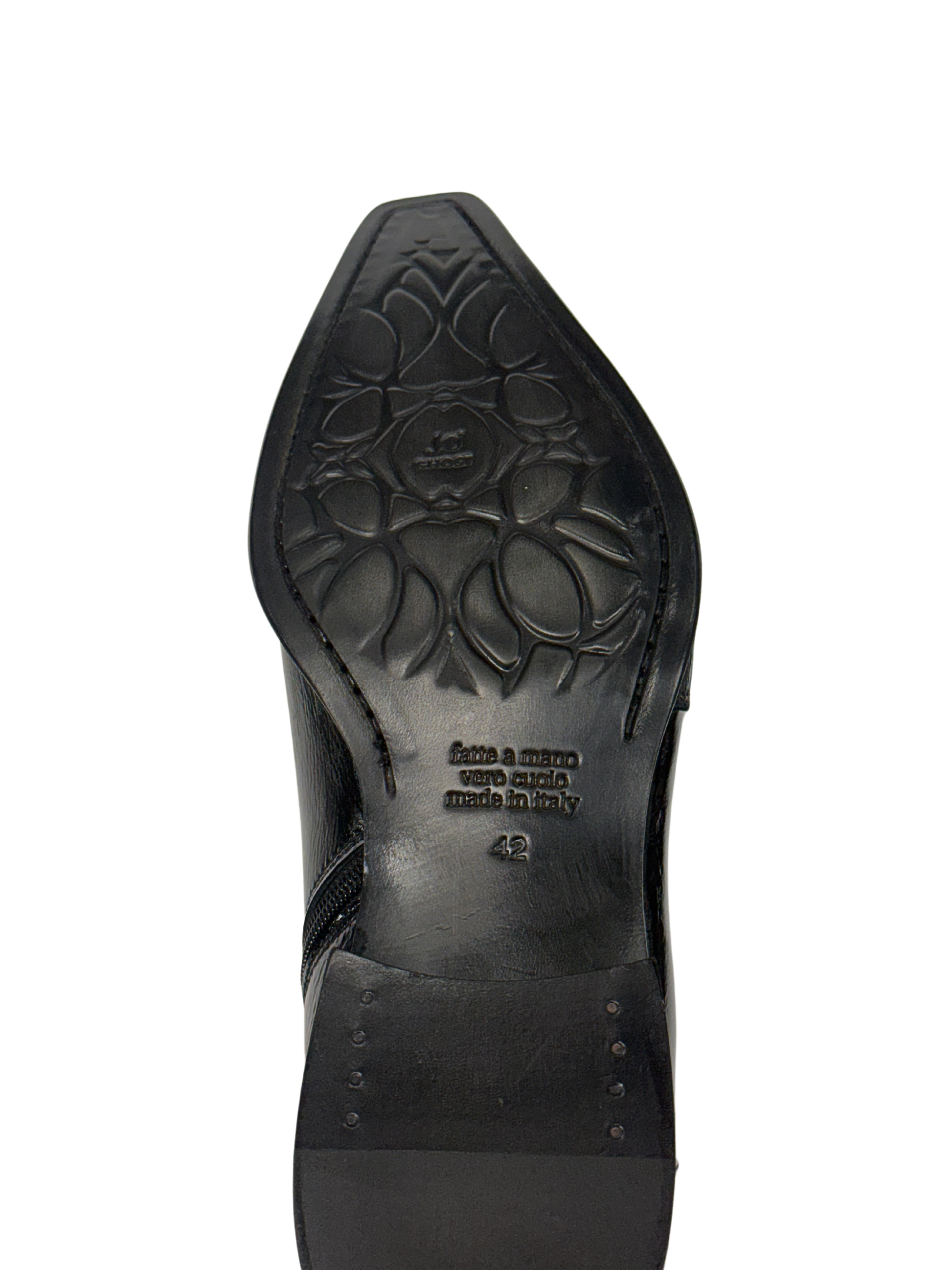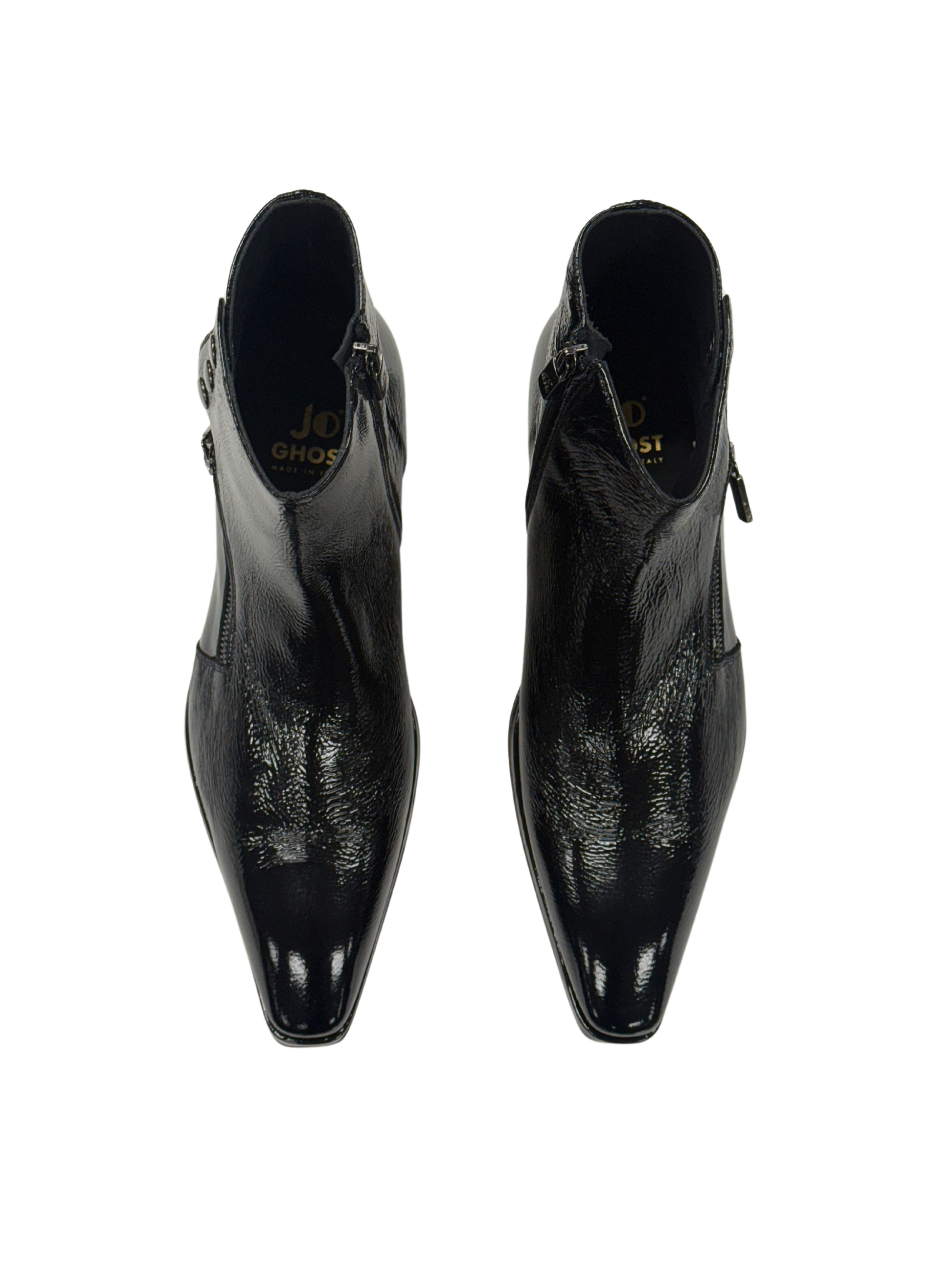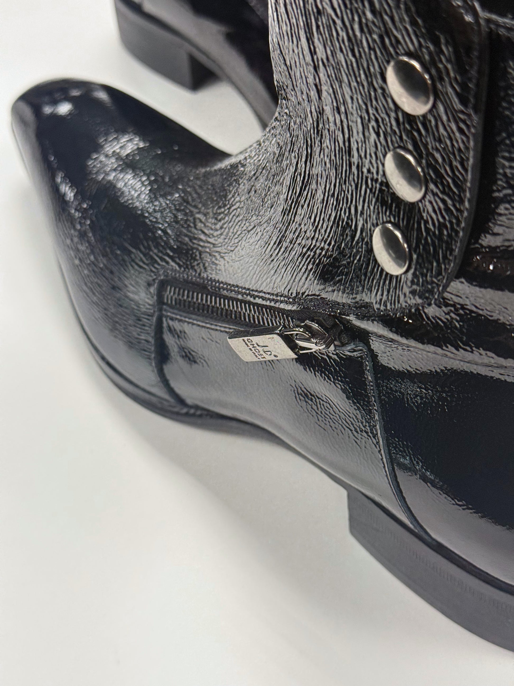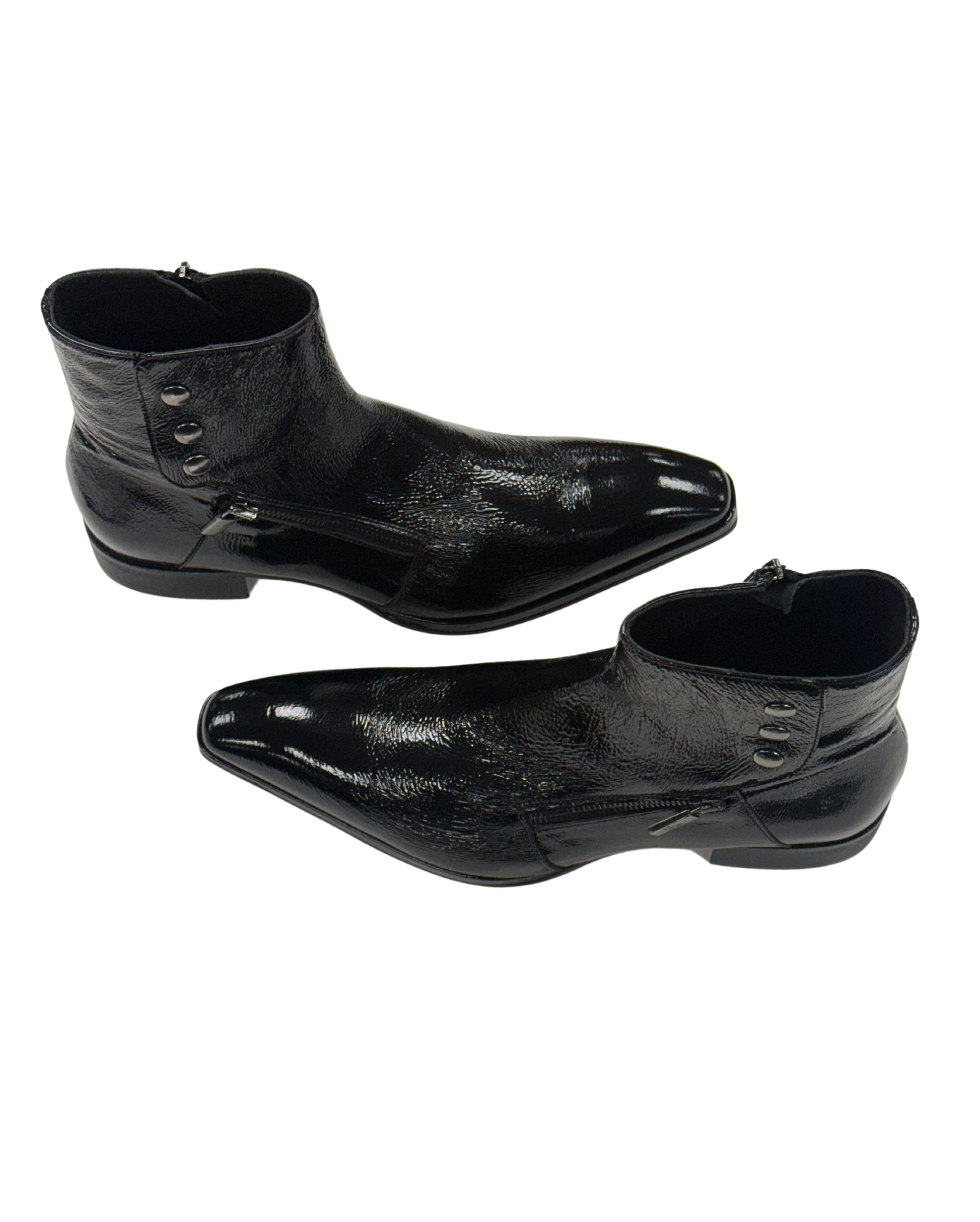 Crafted in Italy from 100% premium leather, this bold black boot by Jo Ghost features a glossy textured finish with a sleek pointed toe. Detailed with a side zip and triple silver-tone button accents for a refined edge. A modern standout with sharp Italian structure and statement appeal.