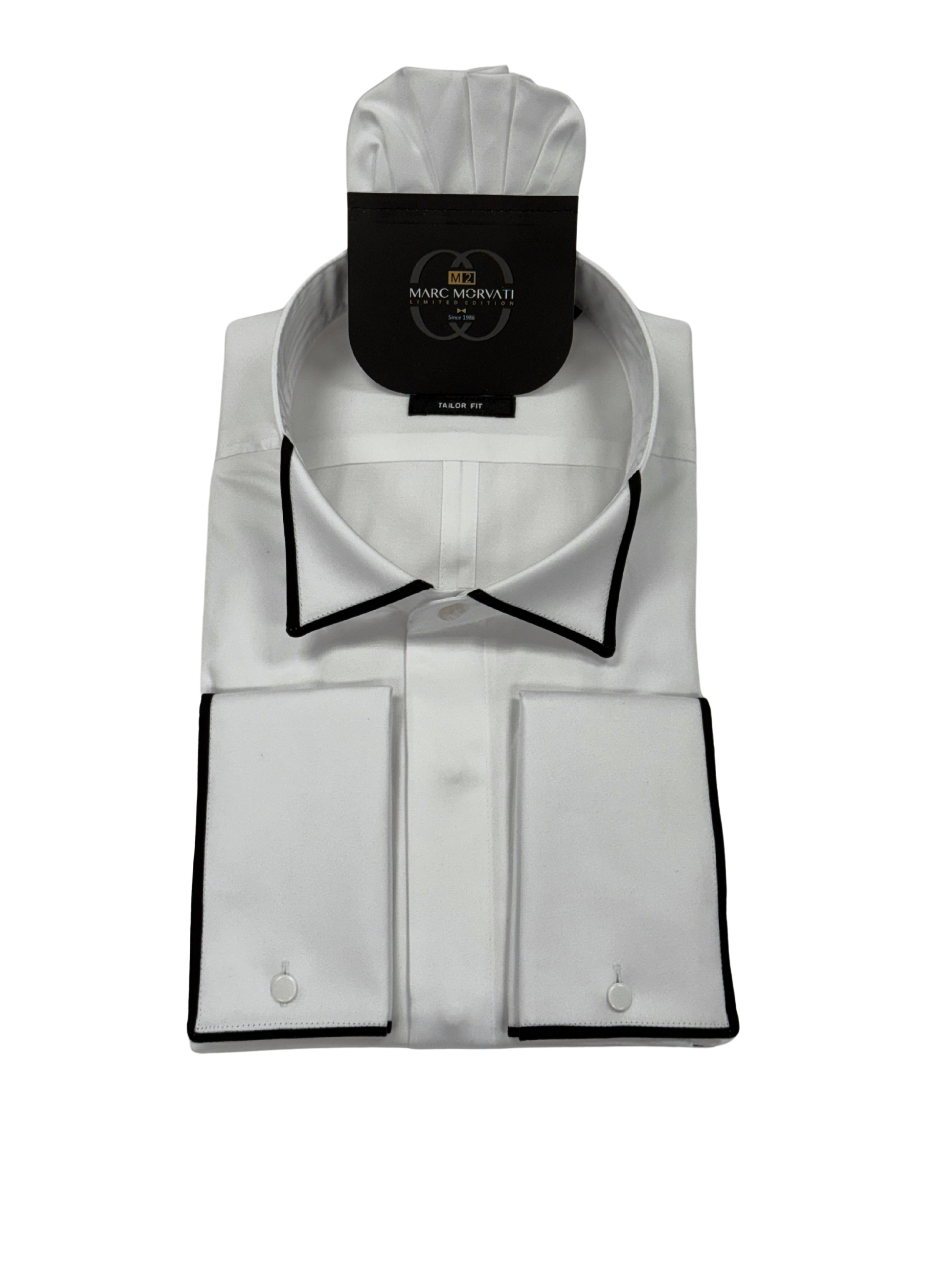 Crafted from 100% premium cotton, this white tuxedo shirt features bold black piping along the collar, cuffs, and front placket. Designed with a pleated bib front and French cuffs for a clean, formal finish. Includes a matching pocket square for an elevated, tailored look.