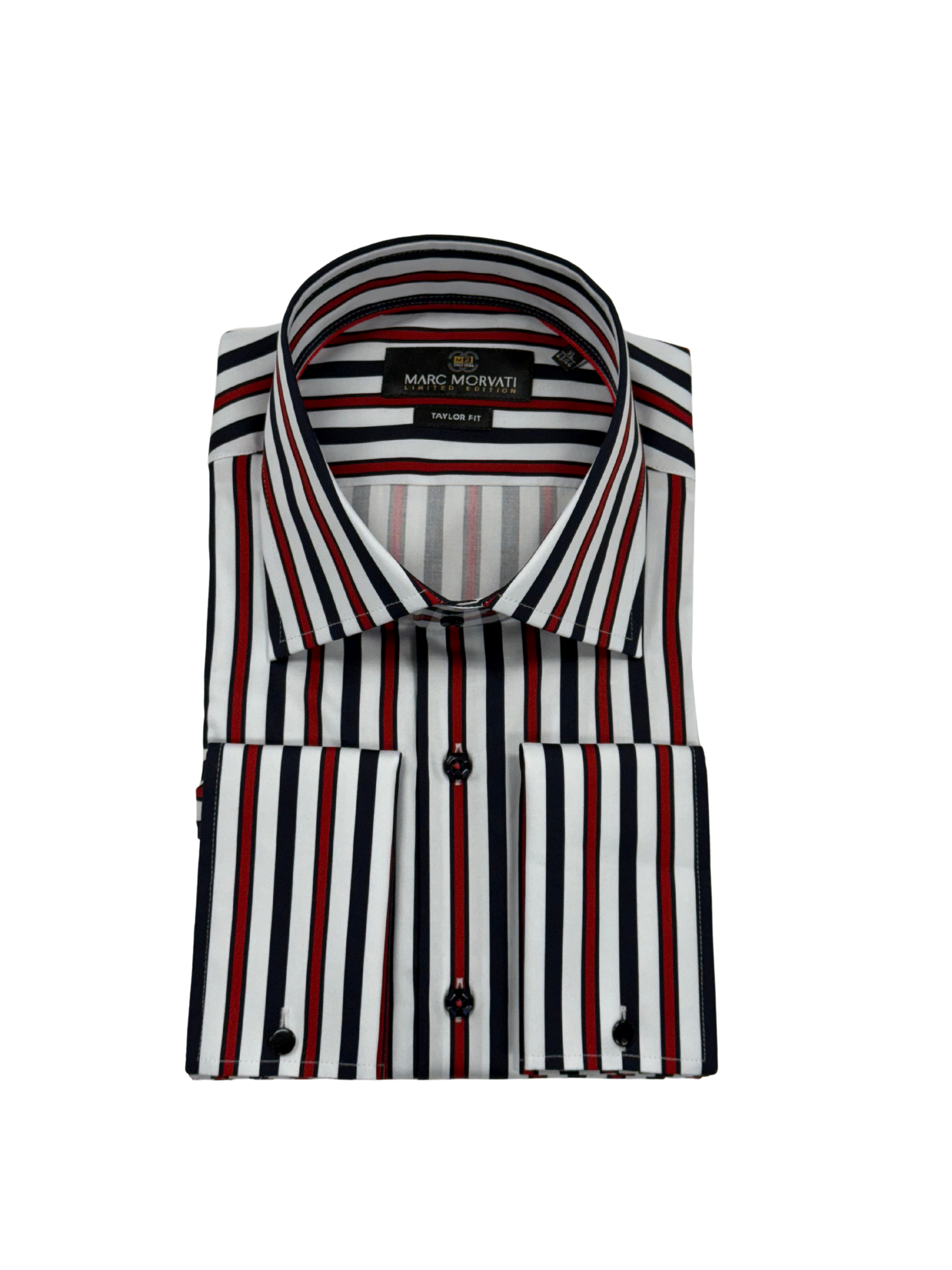 Crafted from 100% premium cotton, this dress shirt features a crisp white base with navy and red stripe detailing. Includes a matching pocket square and a tailored spread collar for a sharp, modern silhouette.